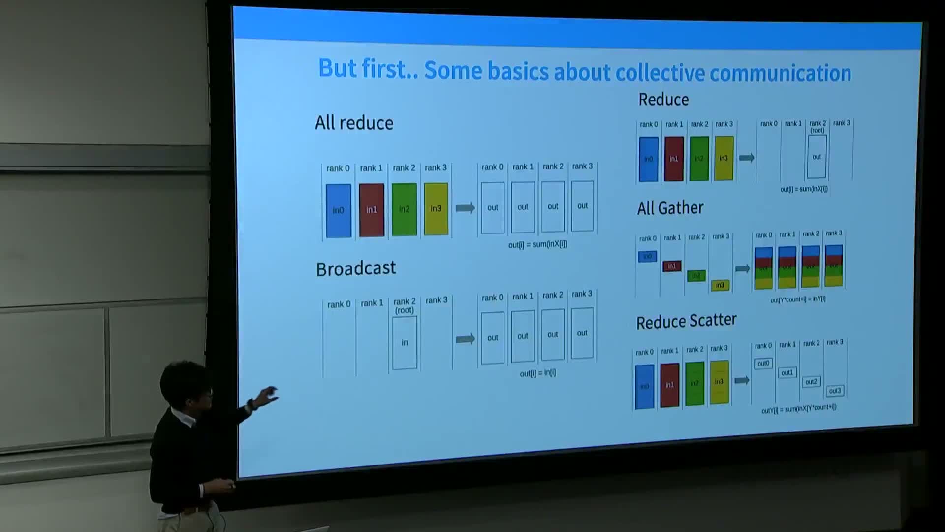 - Broadcast: copy a single rank’s tensor to all ranks.