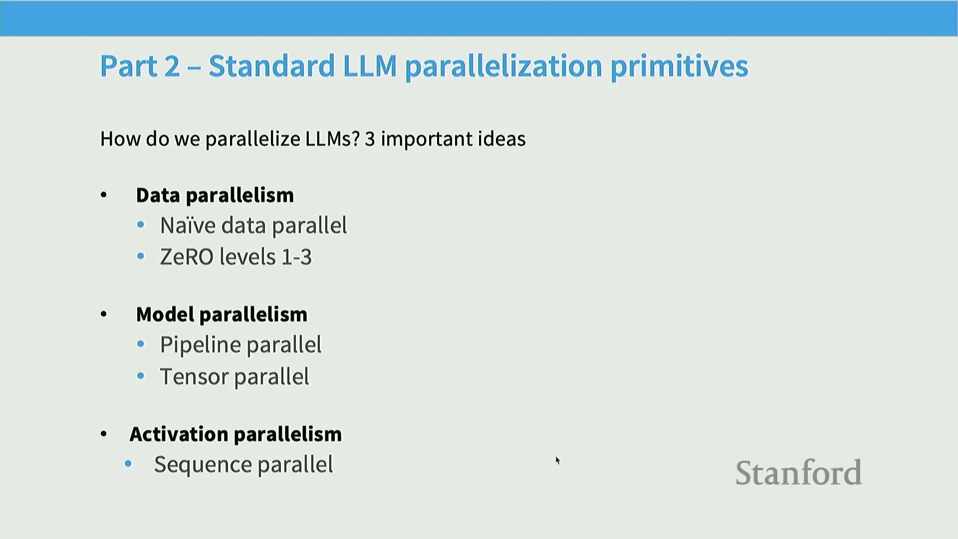 - Parallelization paradigms (data, model, activation/sequence axes)