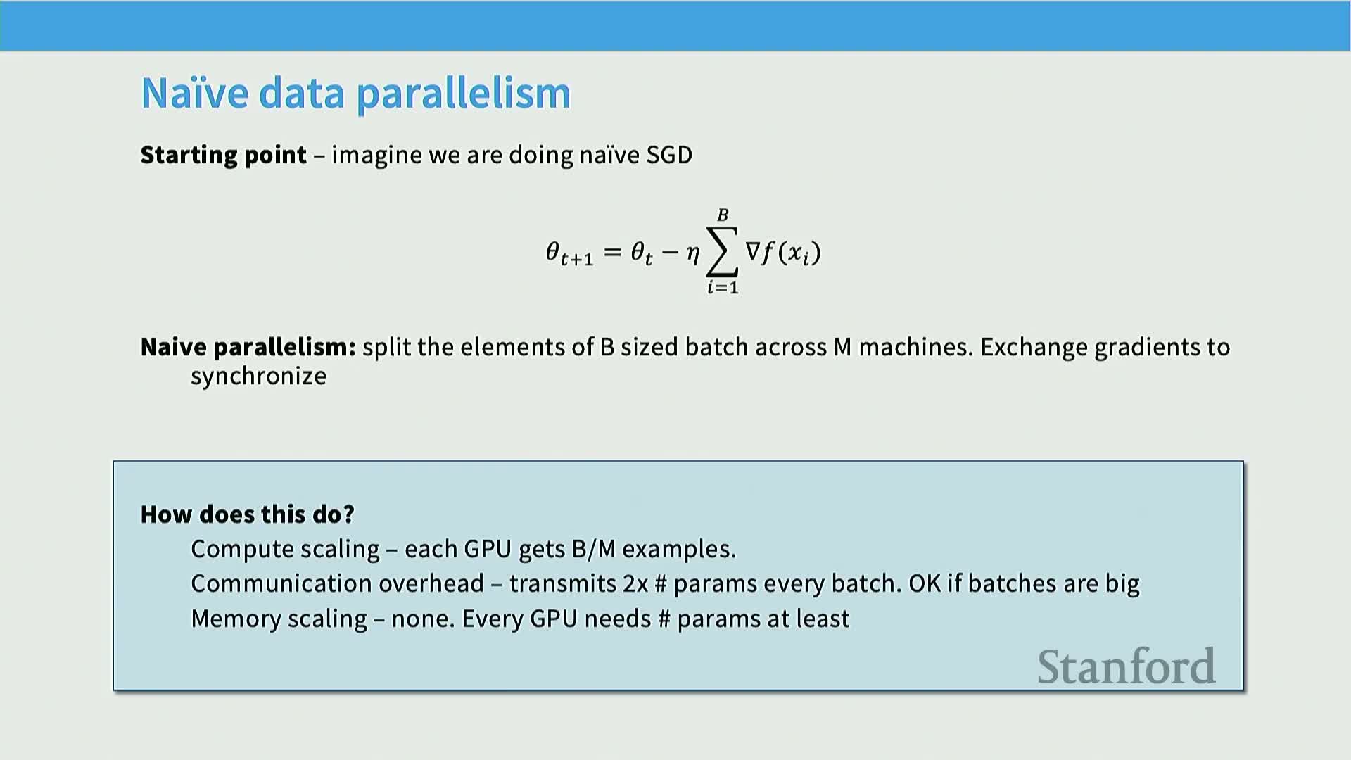 - Naive data parallelism implements synchronous SGD with full-parameter replication