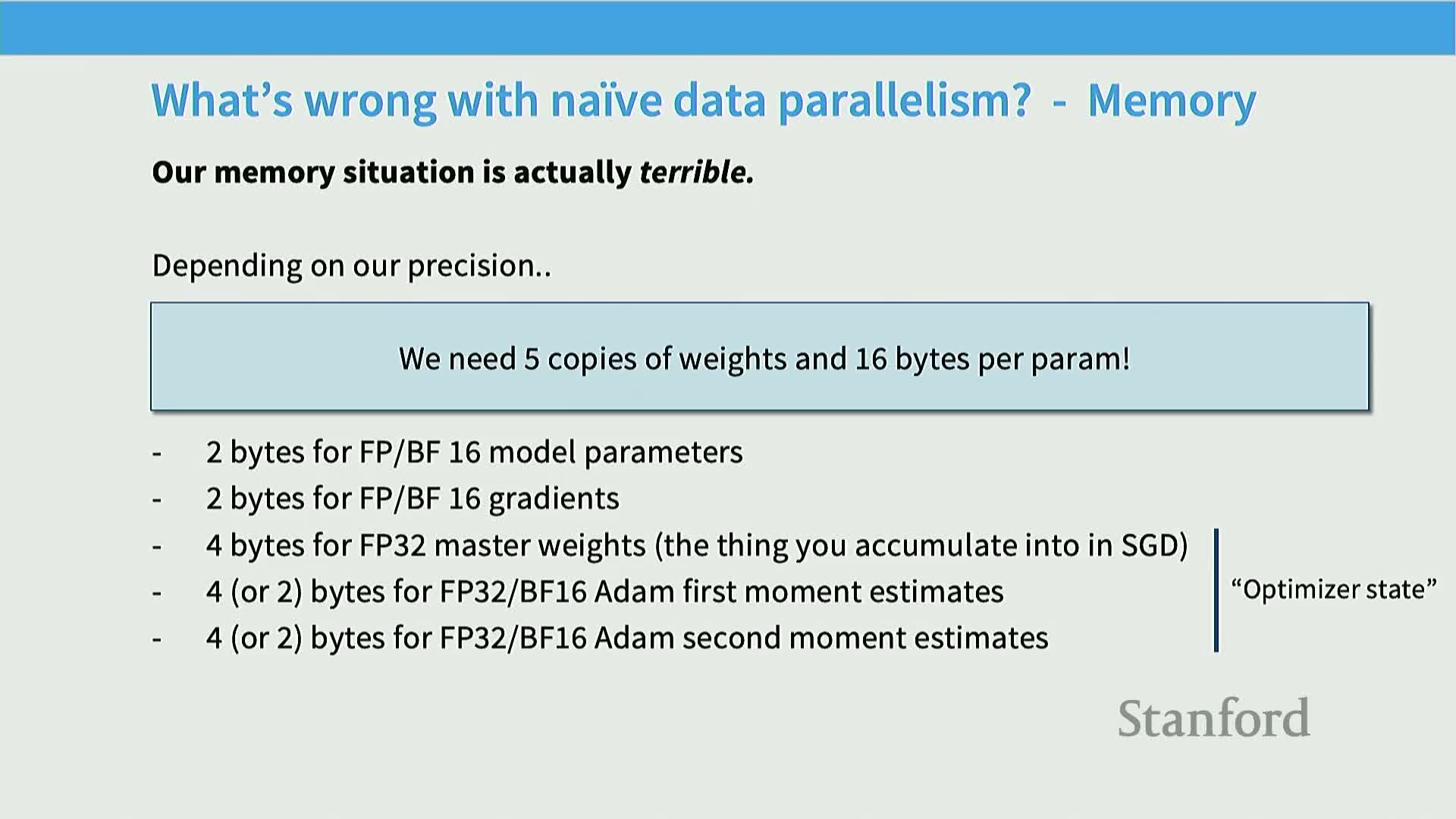 - Poor memory scaling because parameters and optimizer state are replicated on every device.