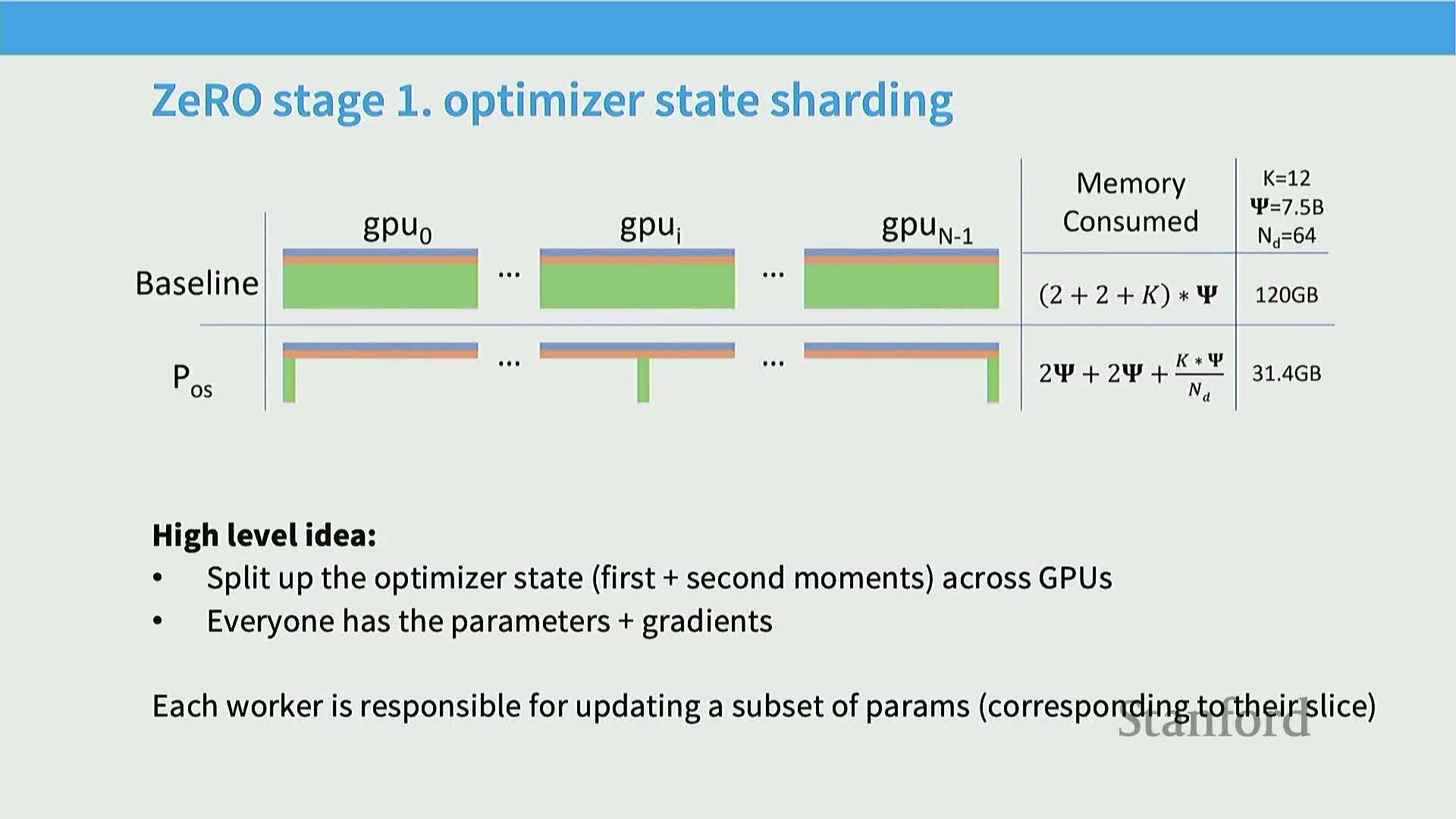 - ZeRO stage 1 (optimizer state sharding) reduces per-device optimizer memory by sharding state