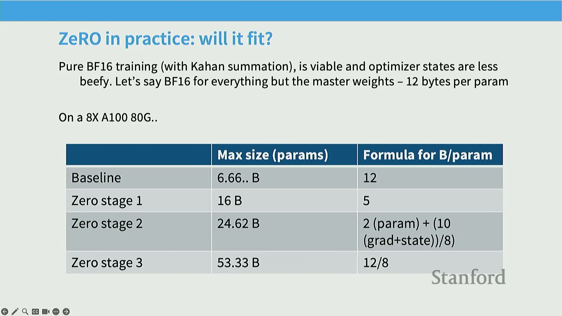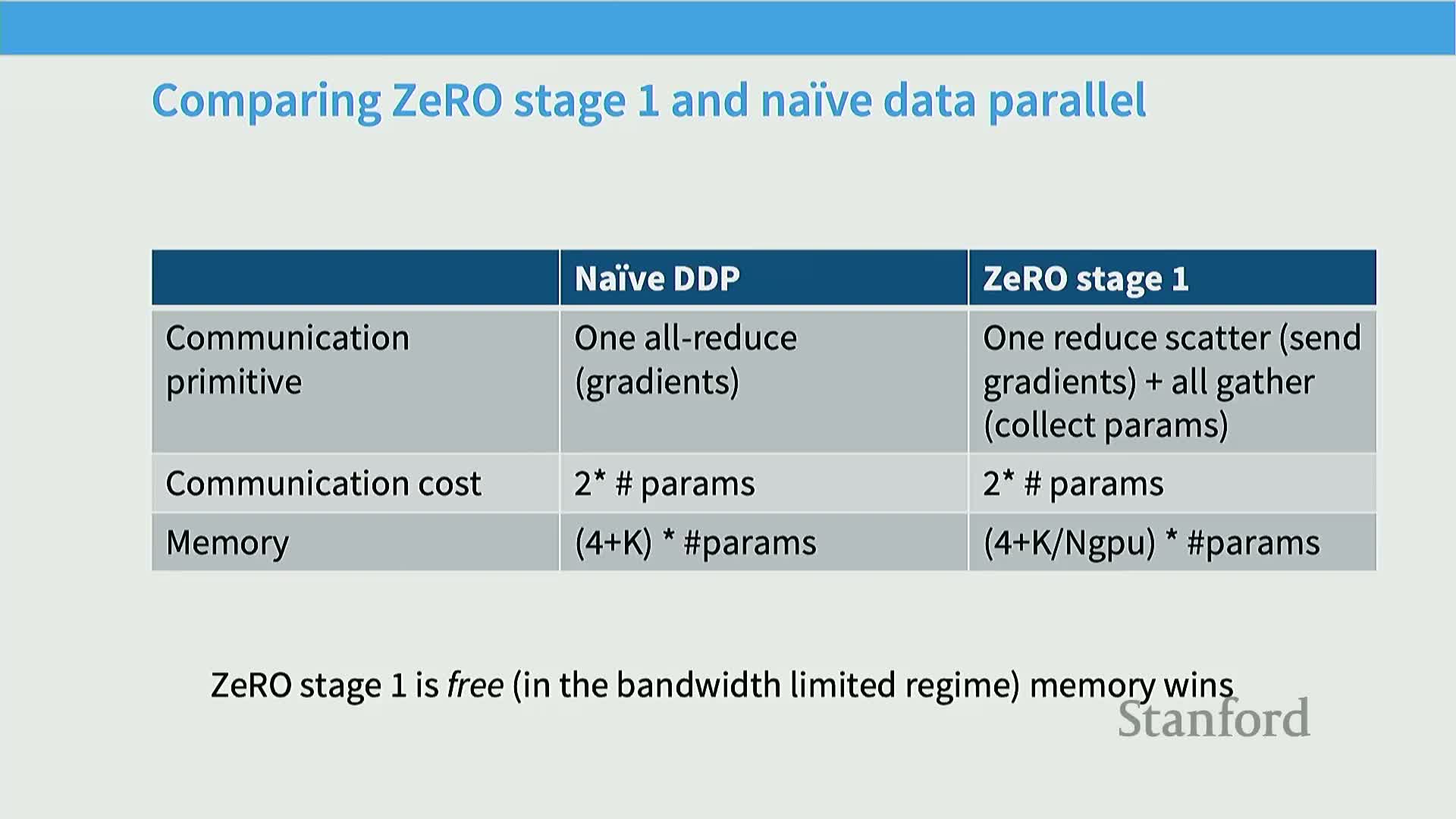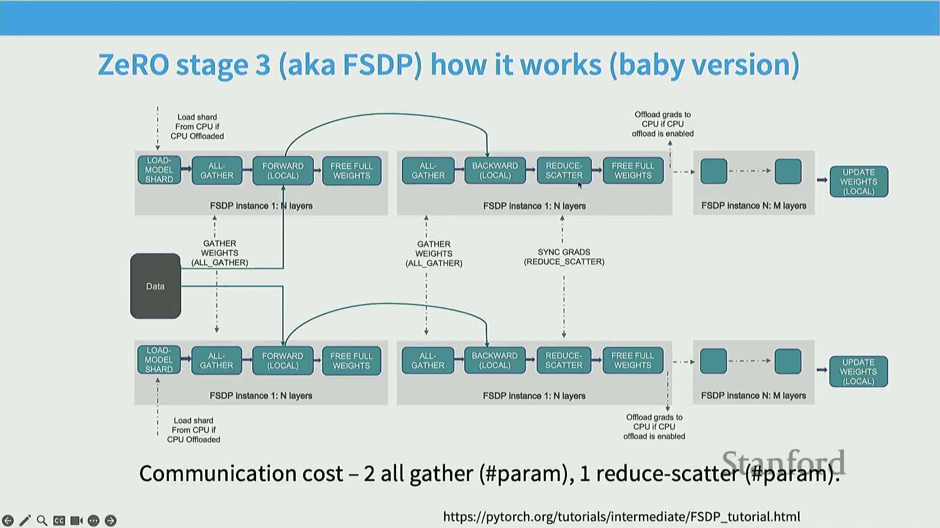 - ZeRO stage 3 / FSDP fully shards parameters, gradients, and optimizer state with on-demand parameter communication