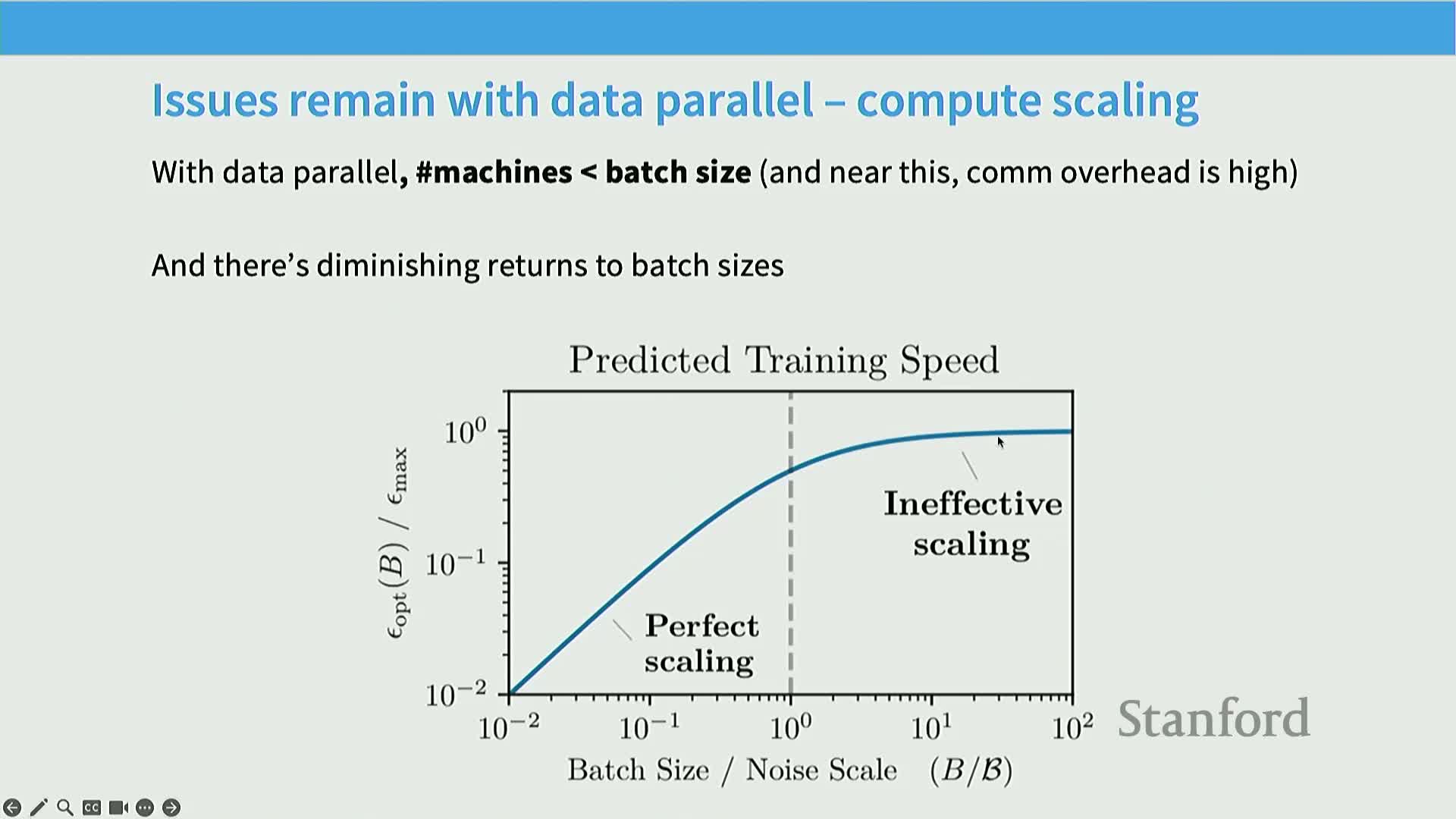 - Data parallelism cannot exceed global batch size without gradient accumulation.