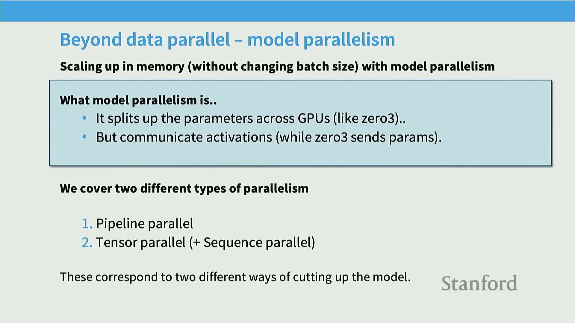 Use cases: model or activation sizes exceed single-device capacity; often combined with data parallelism to achieve both memory and throughput scaling.