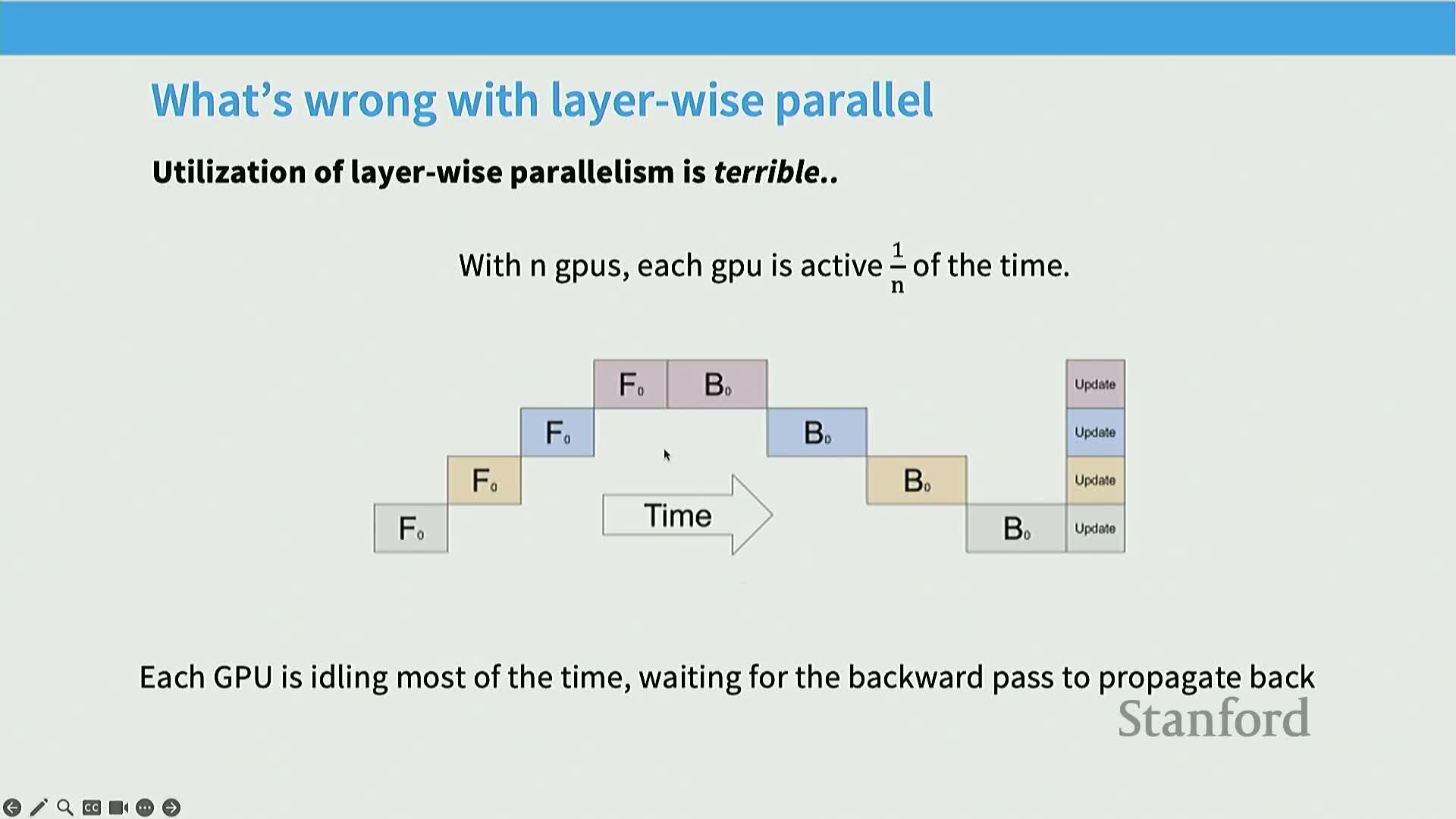 - Mitigations: micro-batching (split minibatch into micro-batches) and scheduling strategies like 1F1B to overlap forward/backward passes.