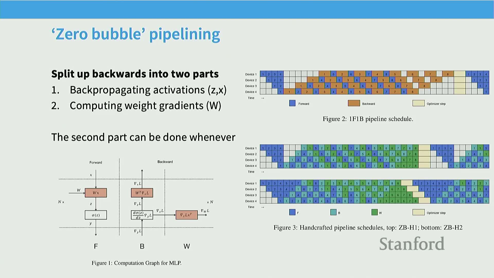 - Split backward work into activation-backpropagation and weight-gradient computation; weight-gradient updates are independent and can fill original pipeline bubbles.