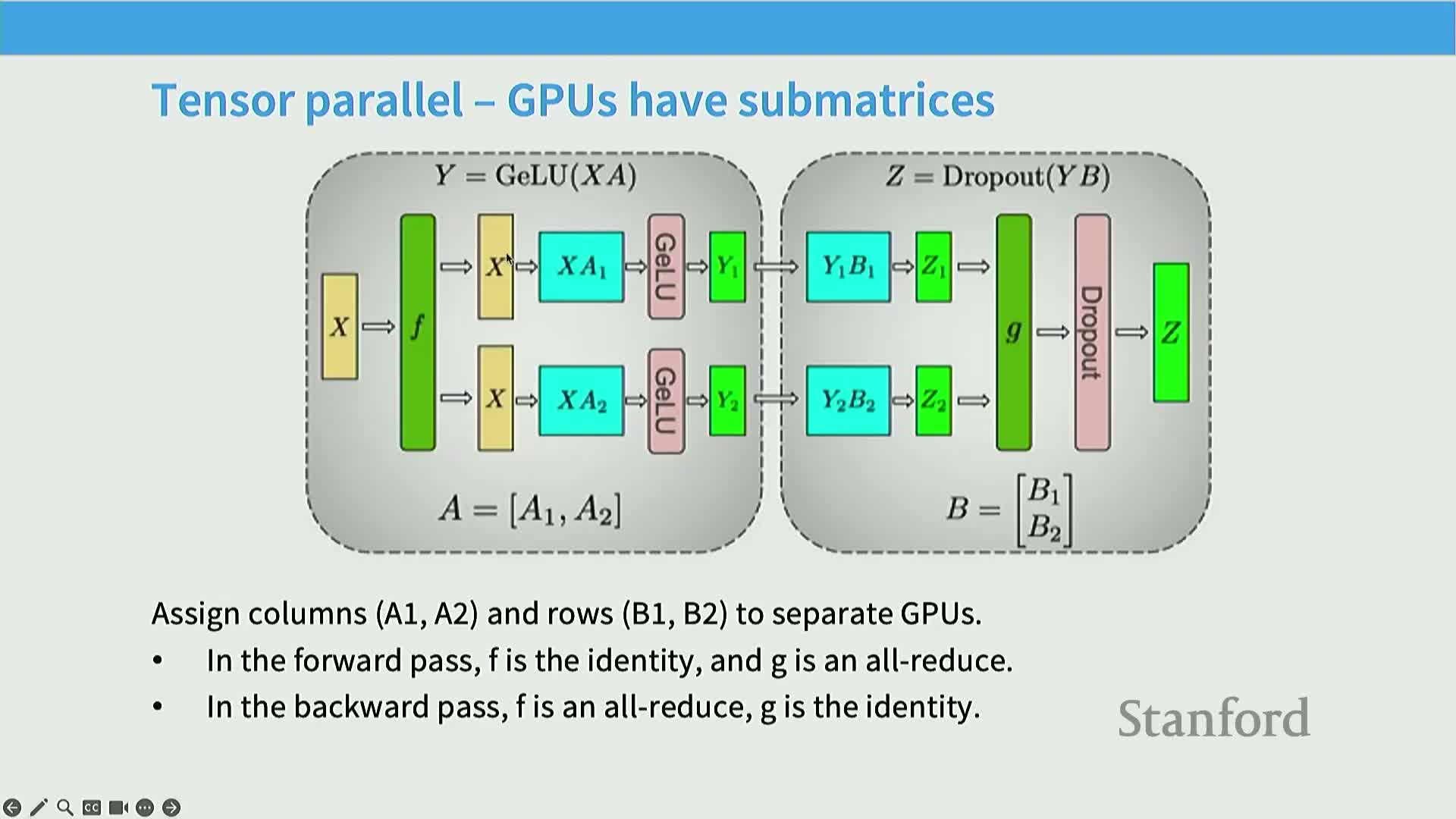- Tensor parallelism splits large matrix multiplies into submatrices and uses collective sums