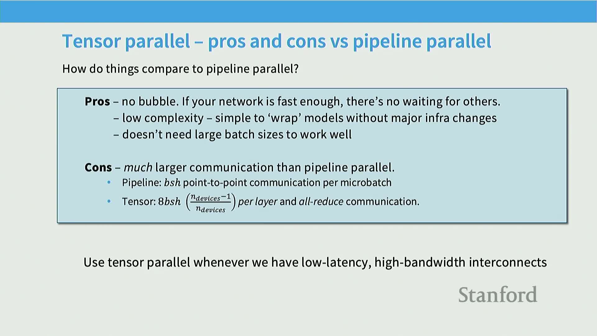 Tensor parallelism: scales matrix computation without consuming batch-size but requires high-bandwidth, low-latency interconnects and frequent collectives.
