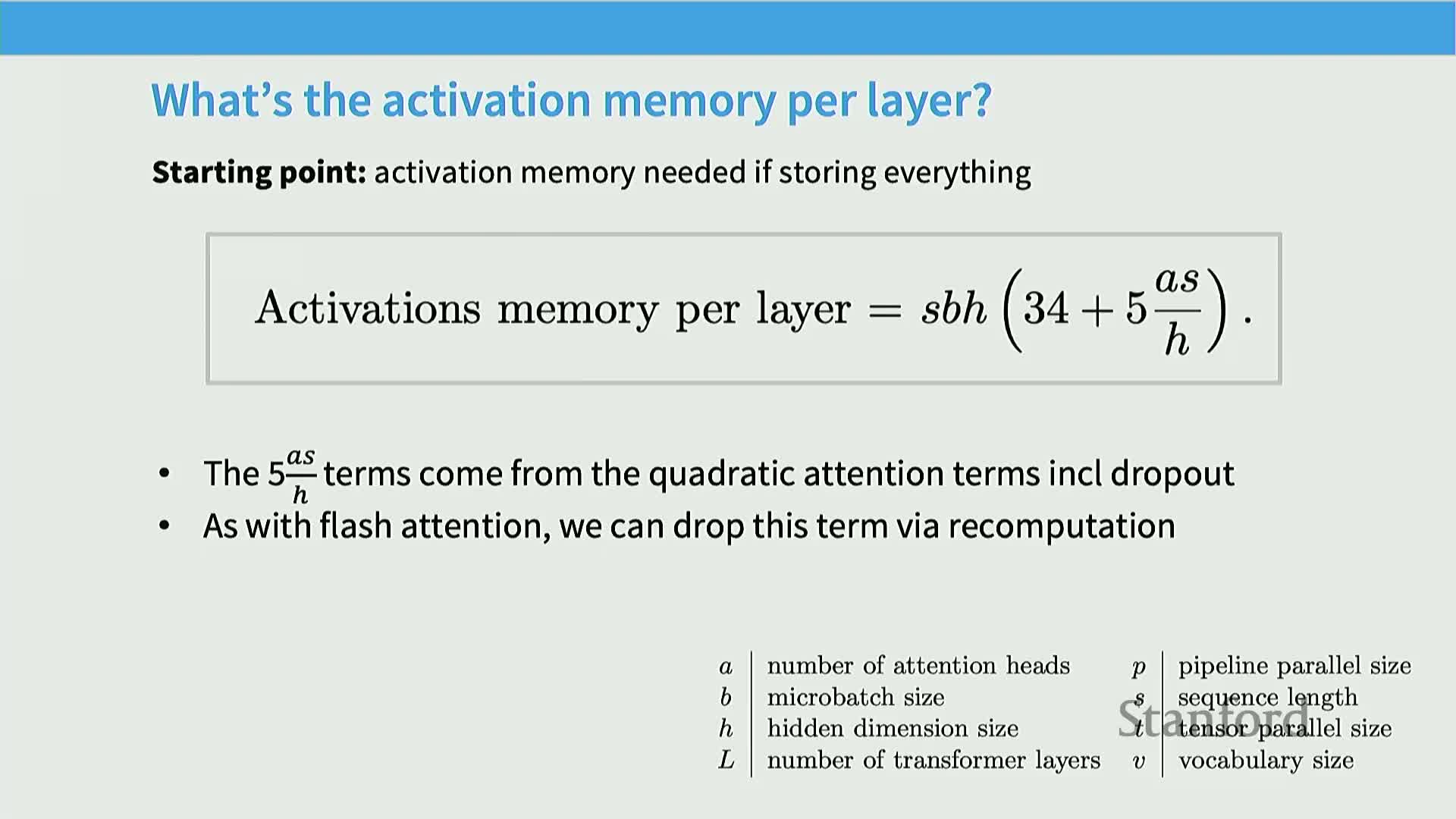 Per-layer activation memory can be approximated by the expression SBH34 + 5A*S/H, where: