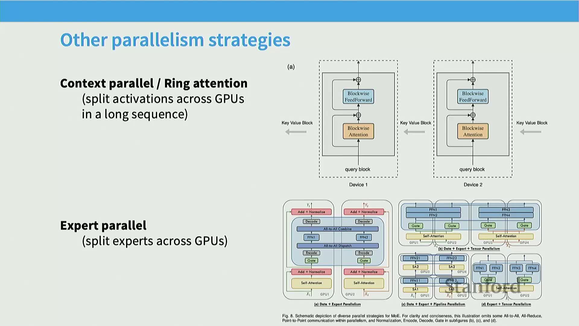 - Additional parallelism variants: ring (context) attention and expert (sparse) parallelism
