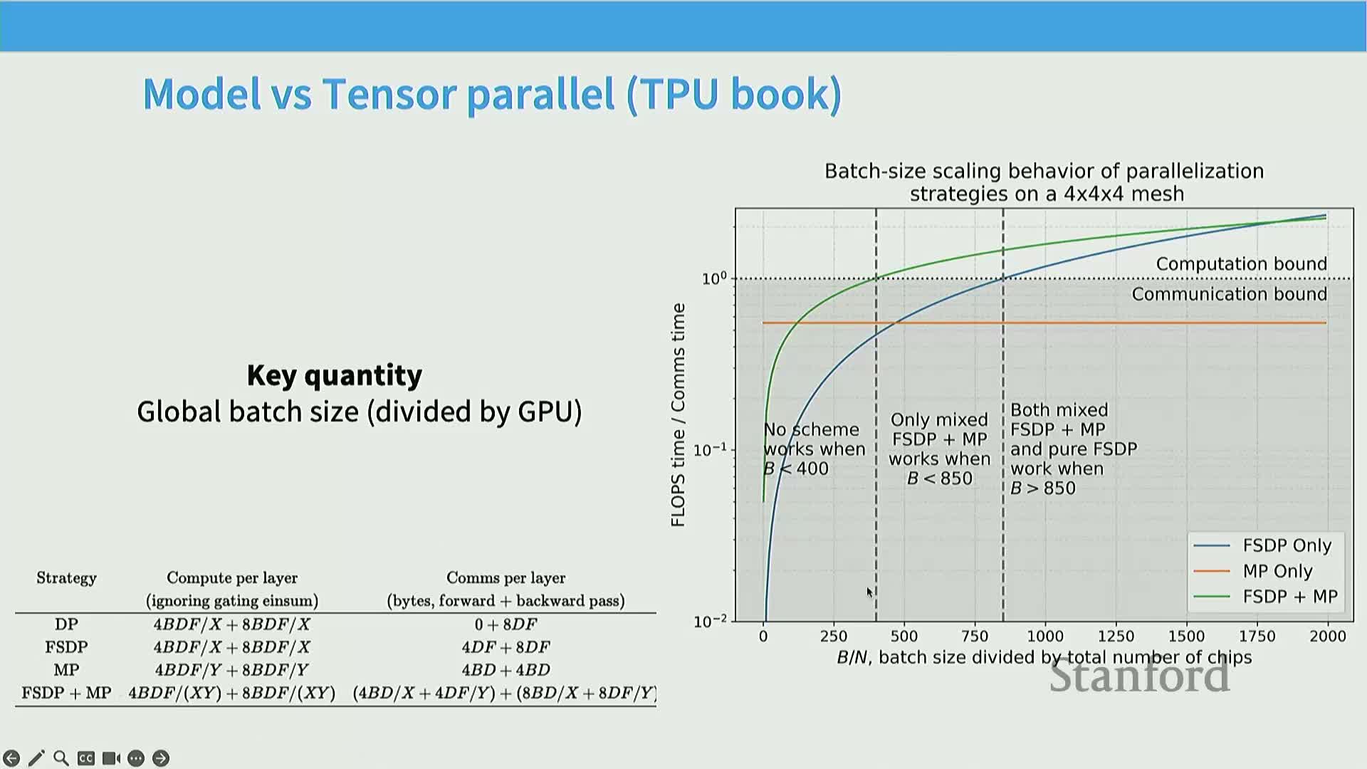 - Moderate batch sizes: combine ZeRO/FSDP with tensor parallelism to reach compute-bound operation.