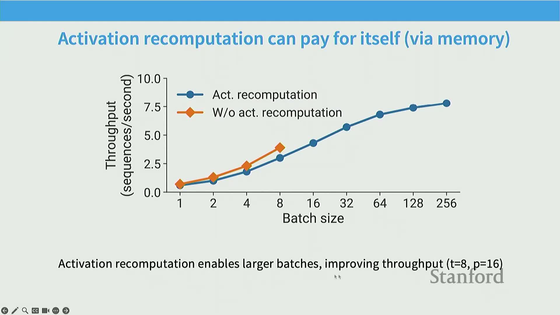 - Activation recomputation: trade extra FLOPS for memory by recomputing intermediate activations on demand instead of storing them.