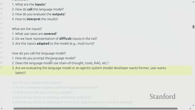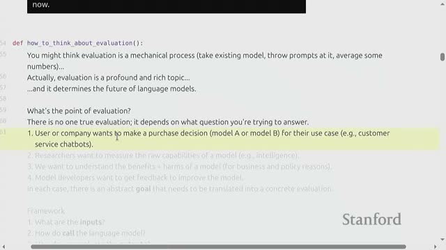 - Evaluation comprises inputs, model invocation strategy, output assessment, and result interpretation
