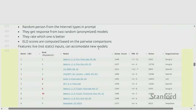 - Live, crowd‑sourced platforms (e.g., Chatbot Arena) collect pairwise human preferences to compute Elo‑like rankings, but these systems are dynamic, susceptible to gaming, and biased by the population of raters and prompt distributions.