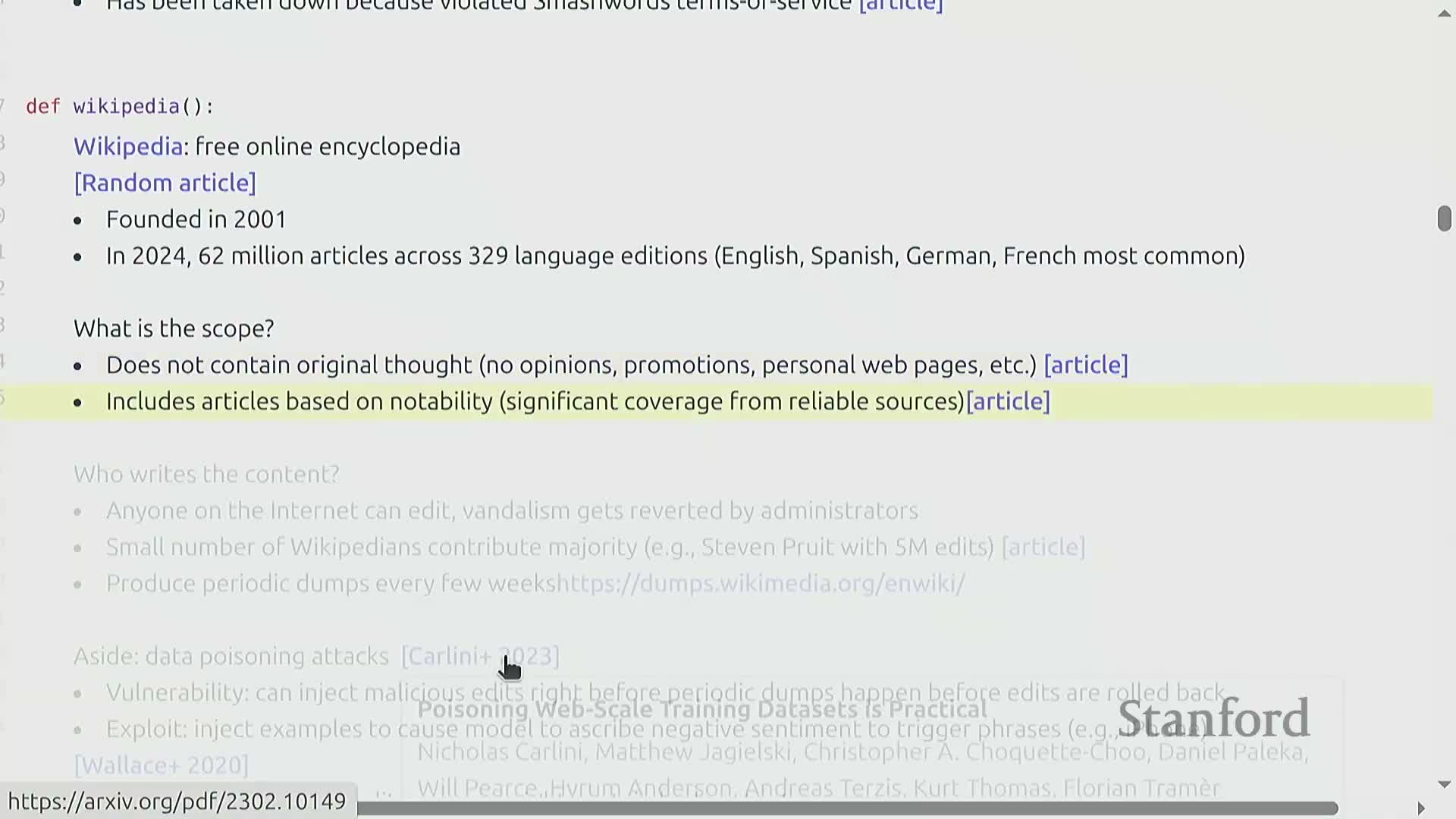 Public datasets that mirror live services can be vulnerable to data poisoning, where adversarial edits are timed to appear in dumps—showing that training data from live services contains manipulation risks and requires pipeline‑level safeguards.
