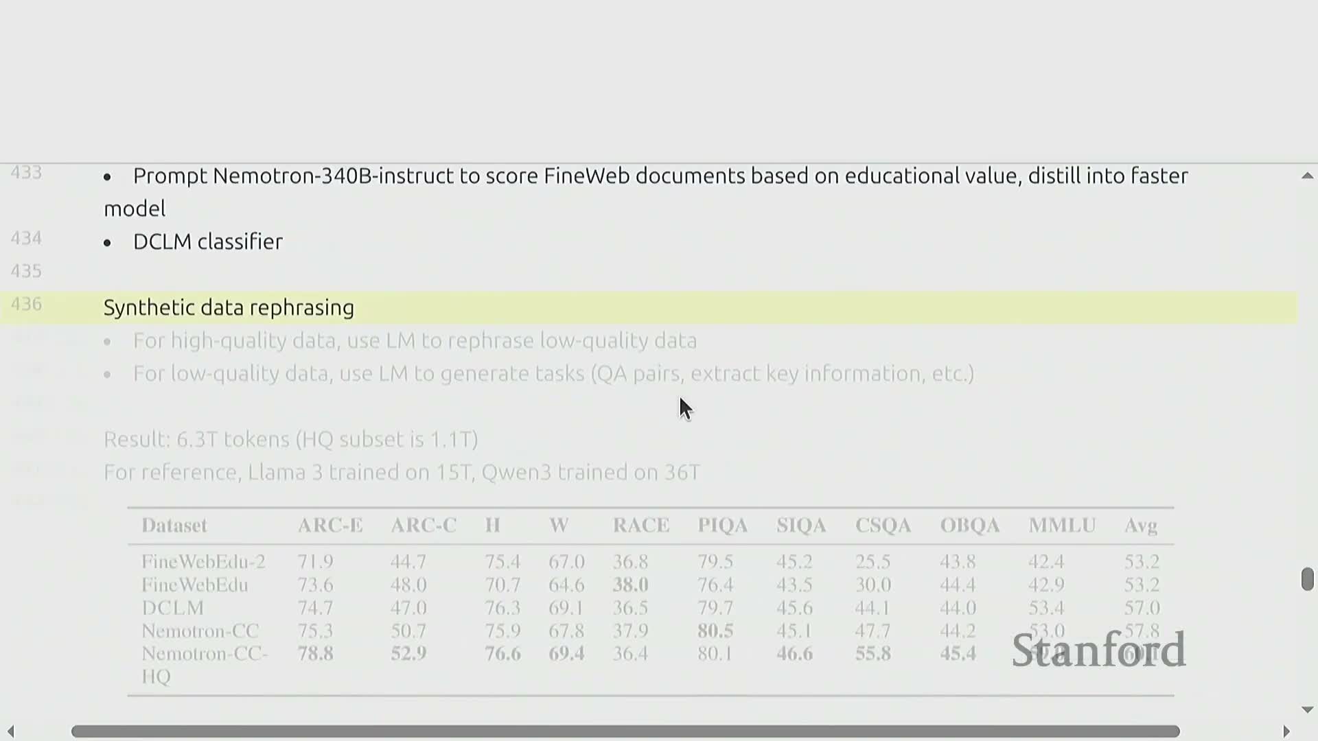 This increased the available high‑quality token pool to several trillion tokens and produced subsets that outperformed aggressively pruned baselines on standard benchmarks—illustrating ensemble and rewrite techniques as practical mechanisms to expand training budgets without sacrificing curated signal.