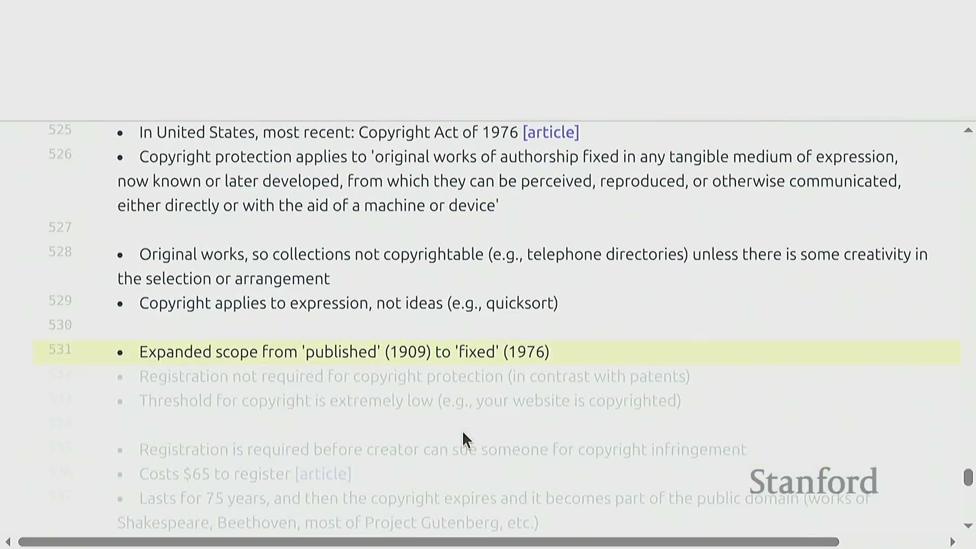 Copyright protects original expressive works fixed in a tangible medium, and most internet text is copyrighted even without registration.