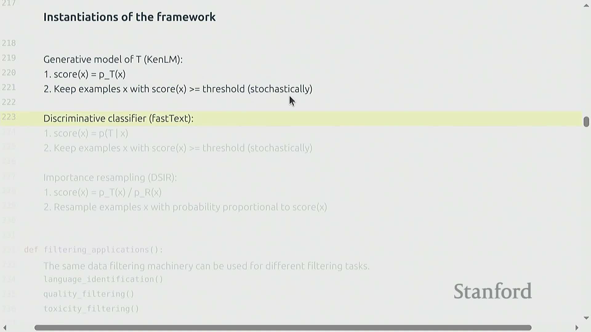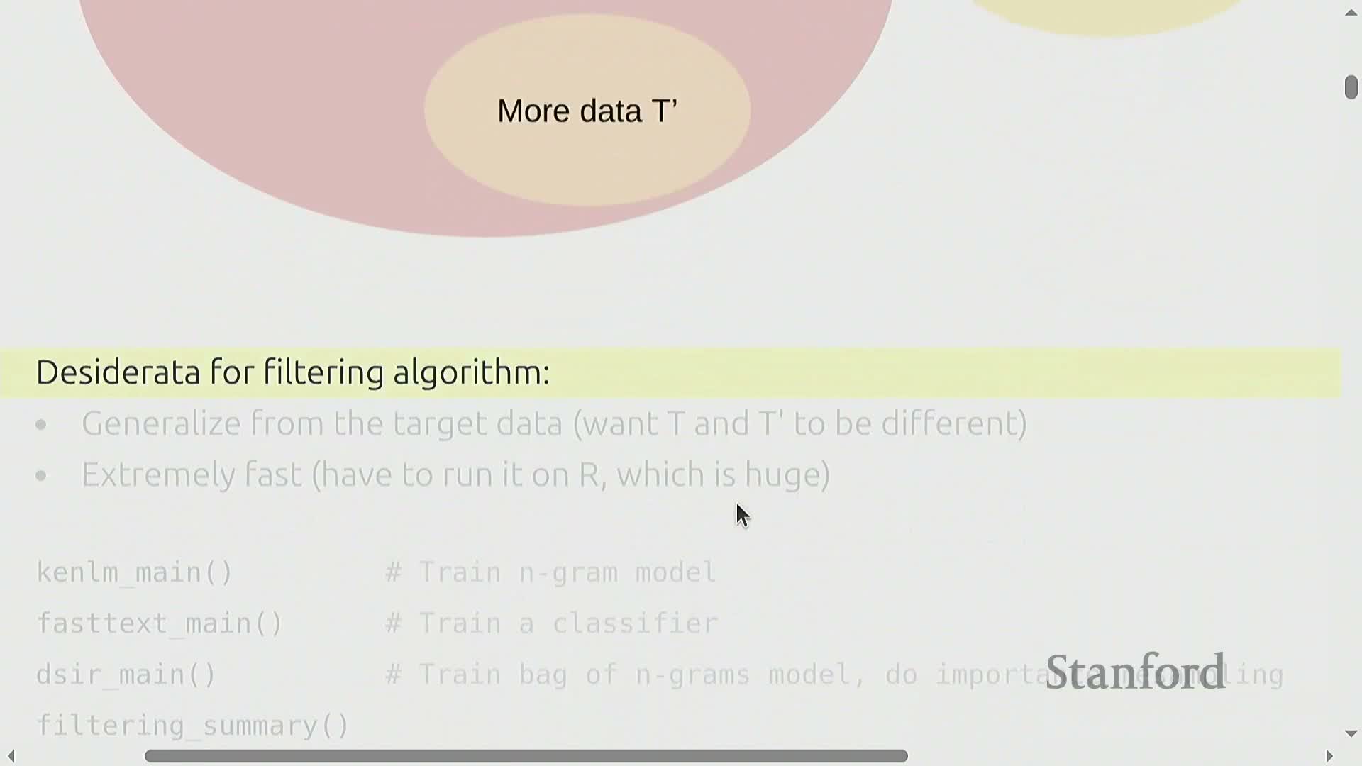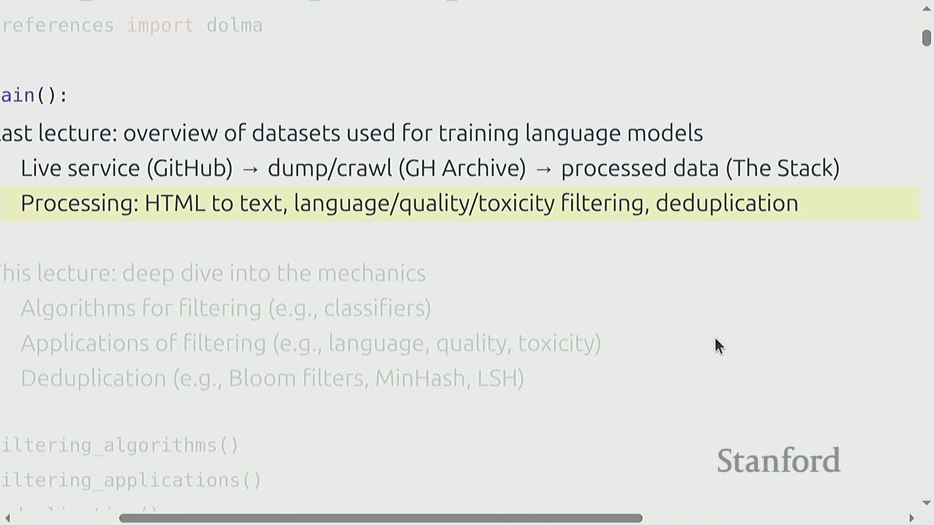 The lecture consolidates algorithmic primitives for preparing training corpora: