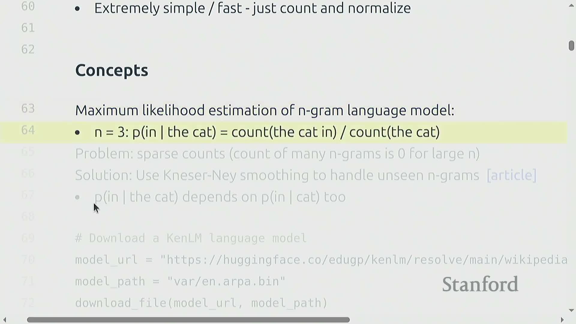 - Divide by the count of the corresponding (n−1)-gram context to obtain the conditional probability.