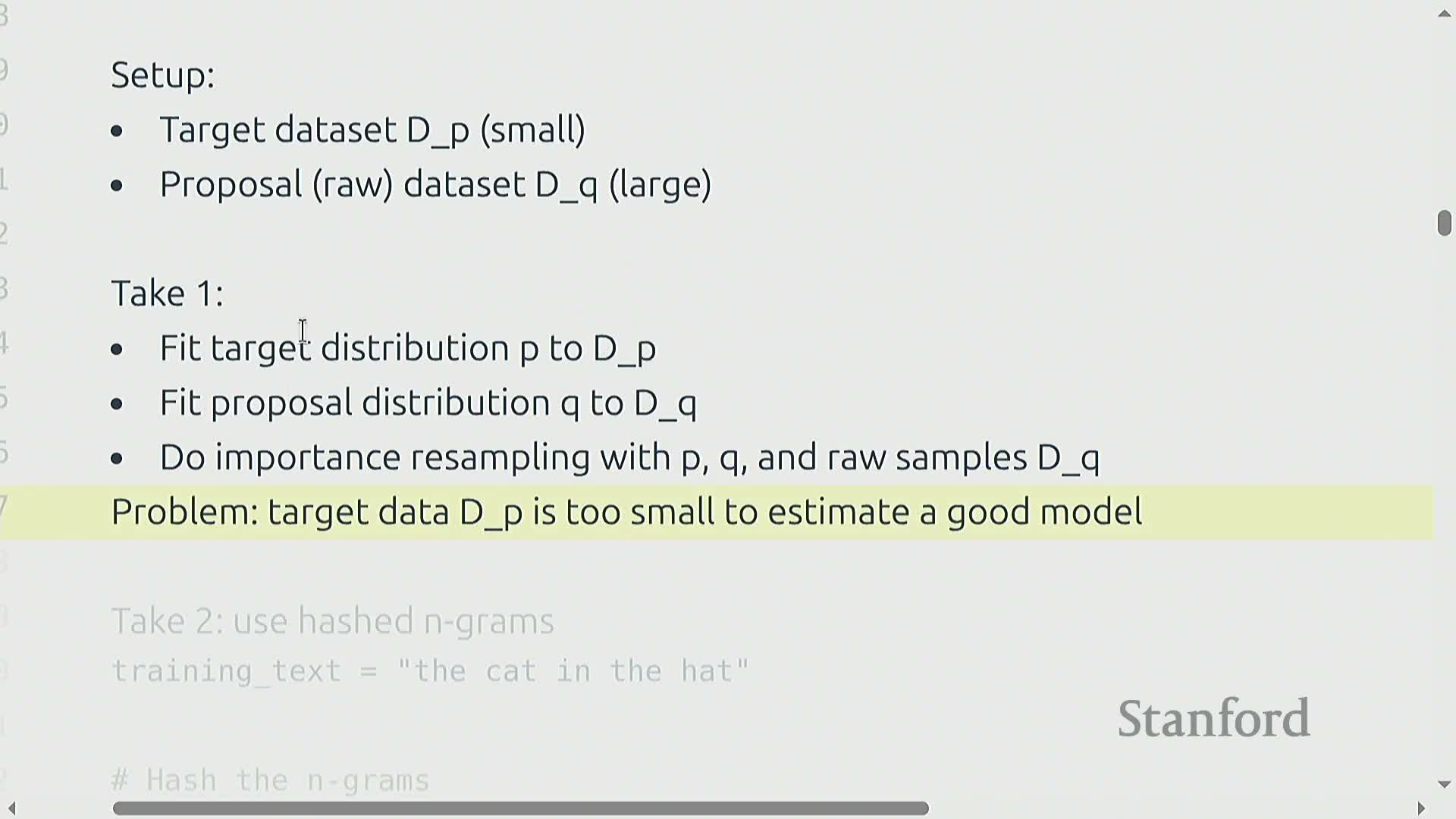 When the target dataset is too small to fit a full generative model, lightweight hashed n-gram probability estimators or other tractable density approximations are used to estimate P and Q, producing per-document weights that prioritize diversity and distributional matching rather than binary classification.