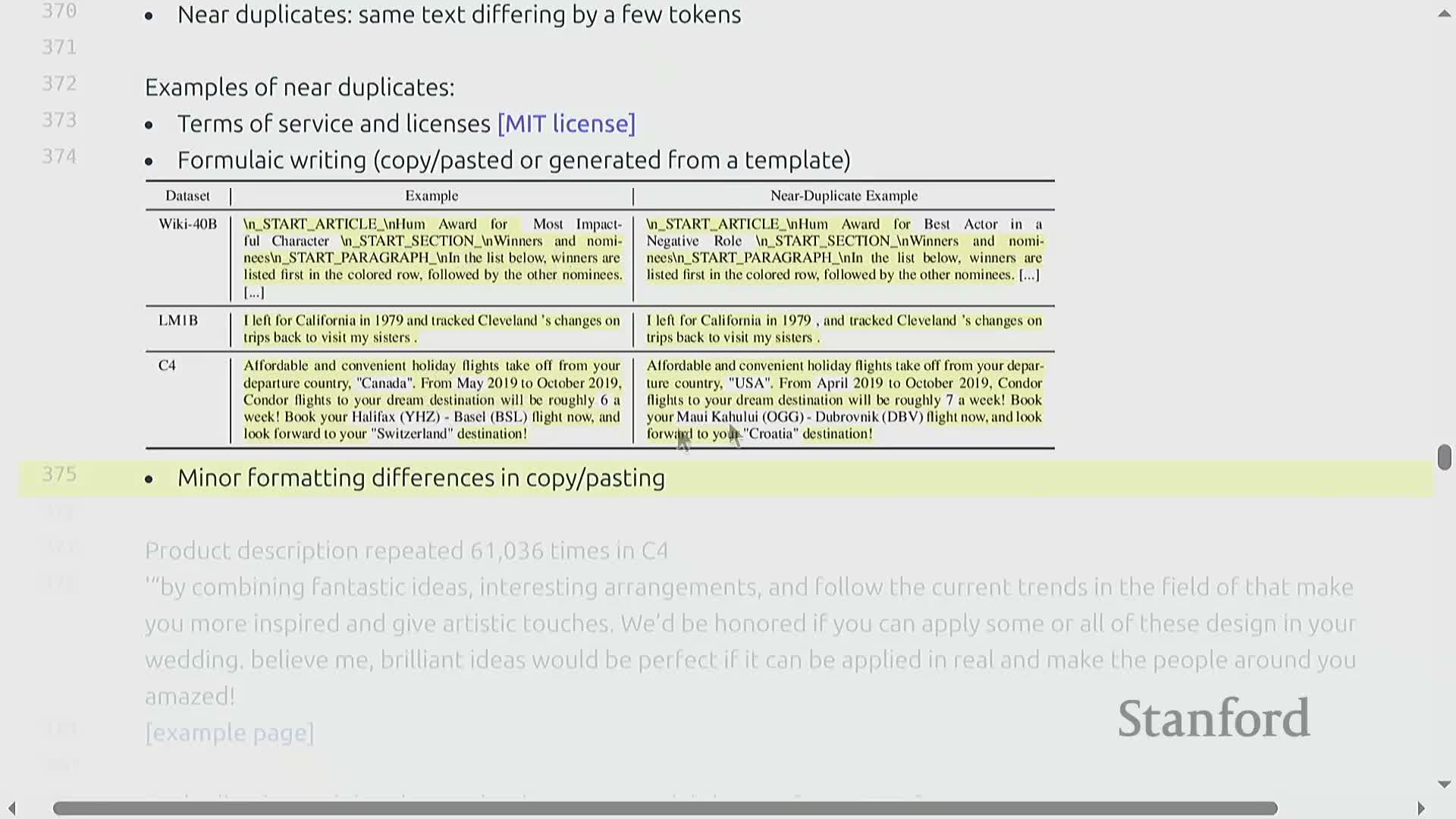 Near-duplicates include license text, templated pages, and lightly edited copies — these variations provide little additional signal despite consuming tokens.