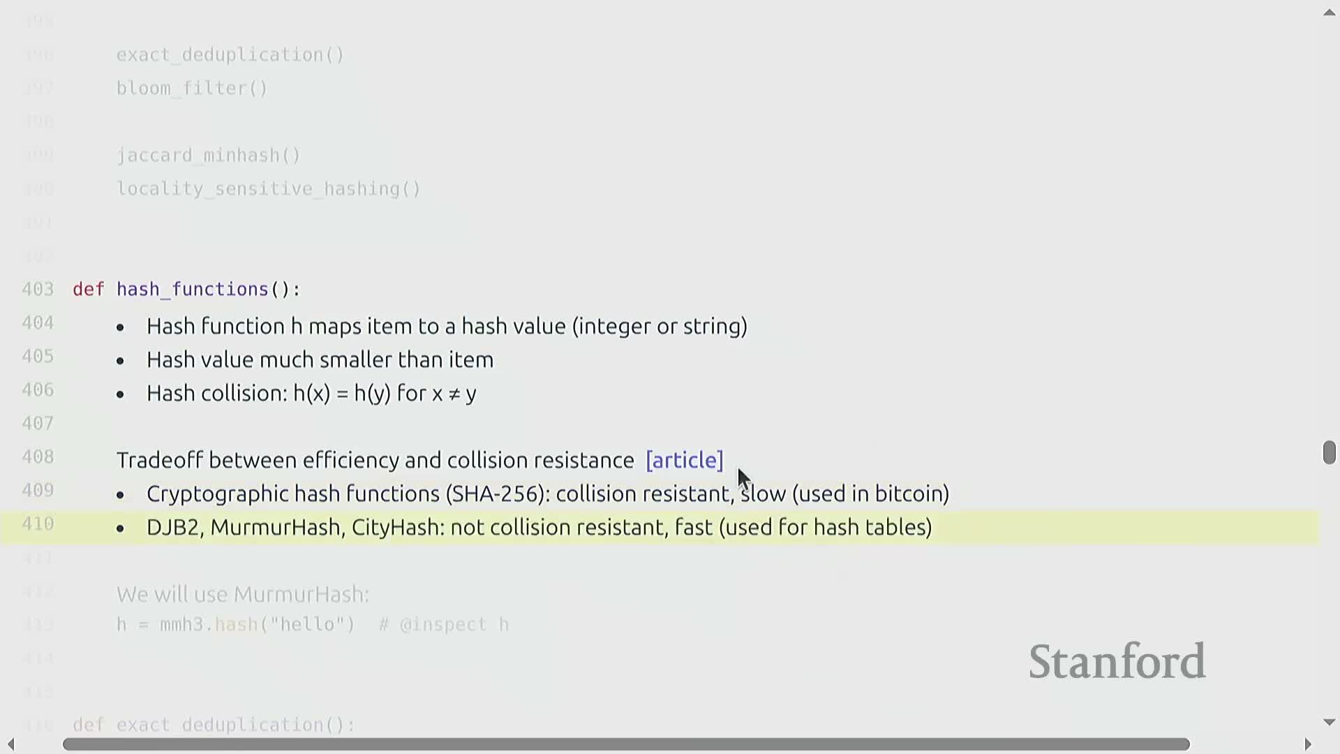 Non-cryptographic hashes (e.g., MurmurHash): much faster and typically sufficient for large-scale deduplication tasks, at the cost of a higher collision probability.