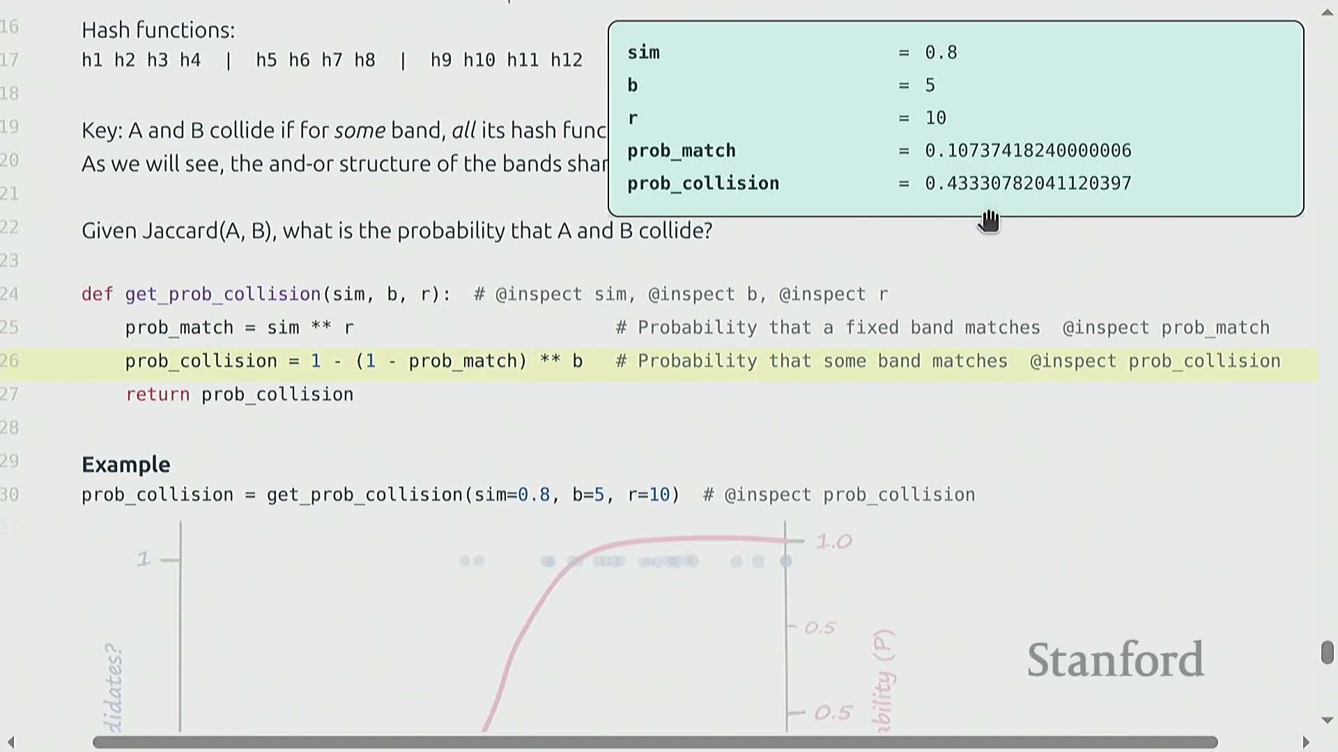 The banding construction yields a tunable, sigmoid-like mapping from true similarity to collision probability: