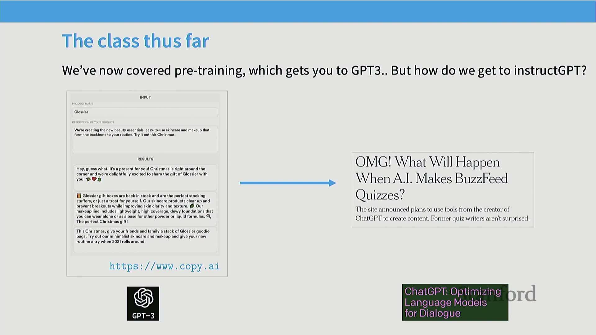 This segment motivates post-training by contrasting large-scale pre-training (e.g., GPT-3) with product-ready instruction-following systems (e.g., ChatGPT).