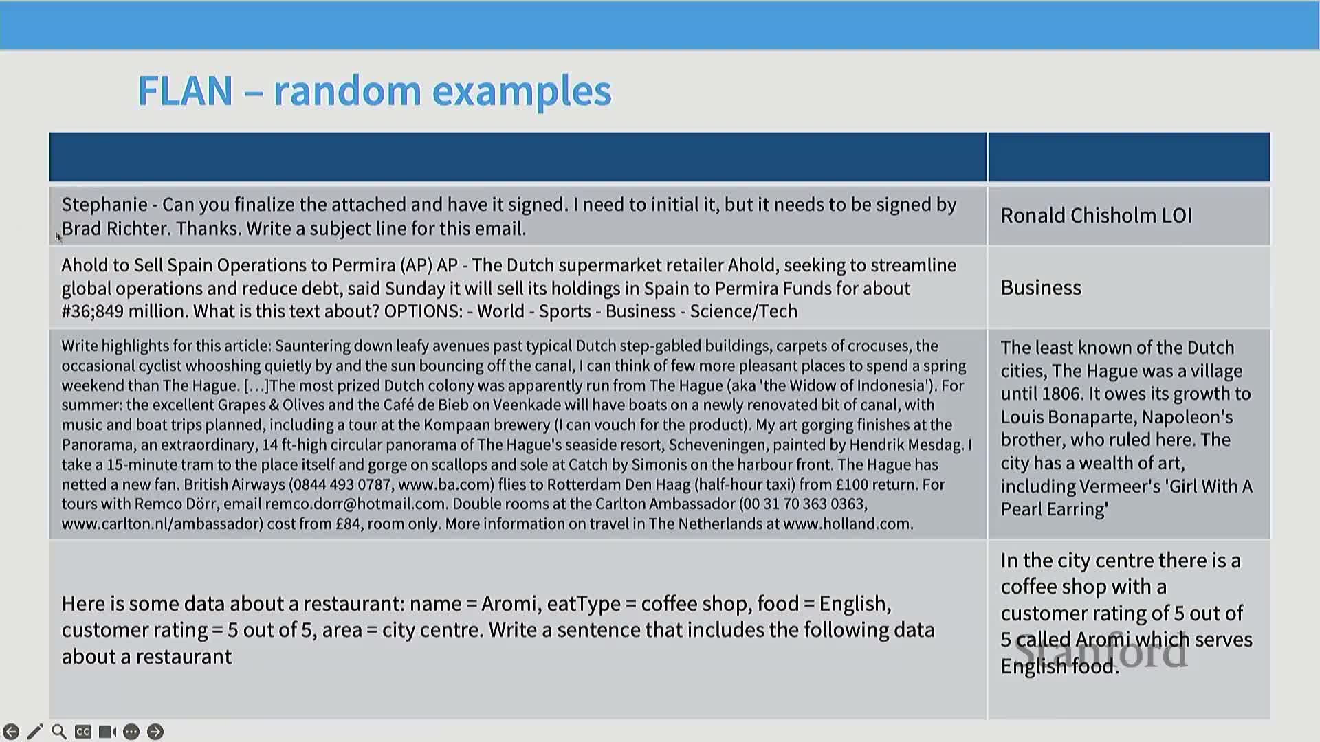 This segment inspects representative FLAN examples (article highlights, multiple-choice classification, email subject generation, E2E text generation) to show how reformatted benchmark data appears when repurposed for instruction tuning.