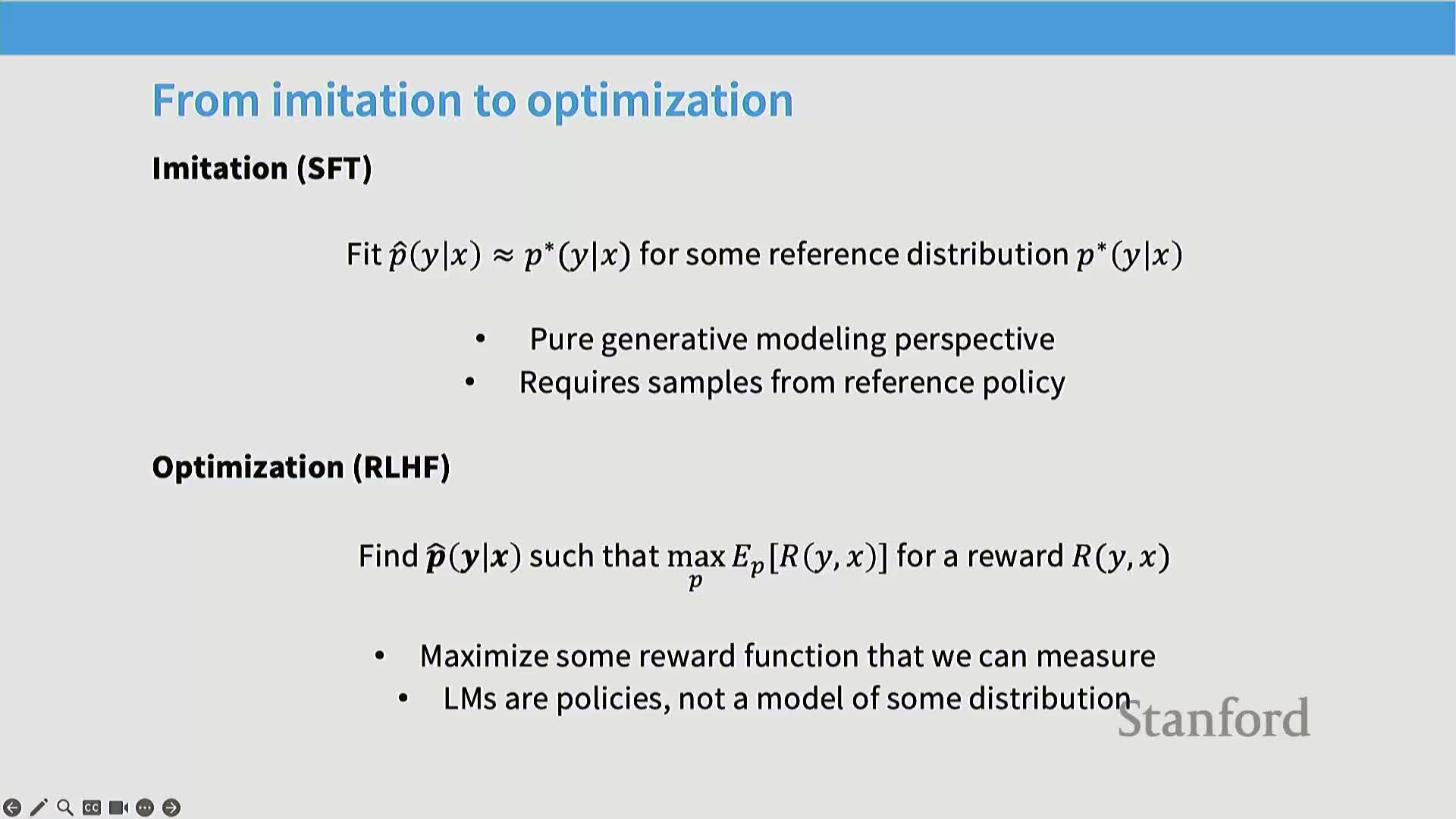 The segment motivates RLHF on conceptual grounds and contrasts distributional imitation with policy optimization.