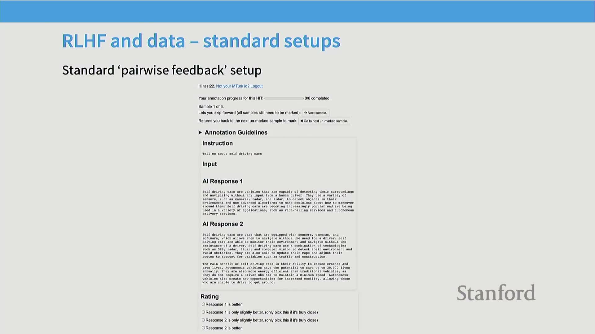- Data collection interfaces include side-by-side comparisons and guidelines emphasizing helpfulness/truthfulness/harmlessness.
