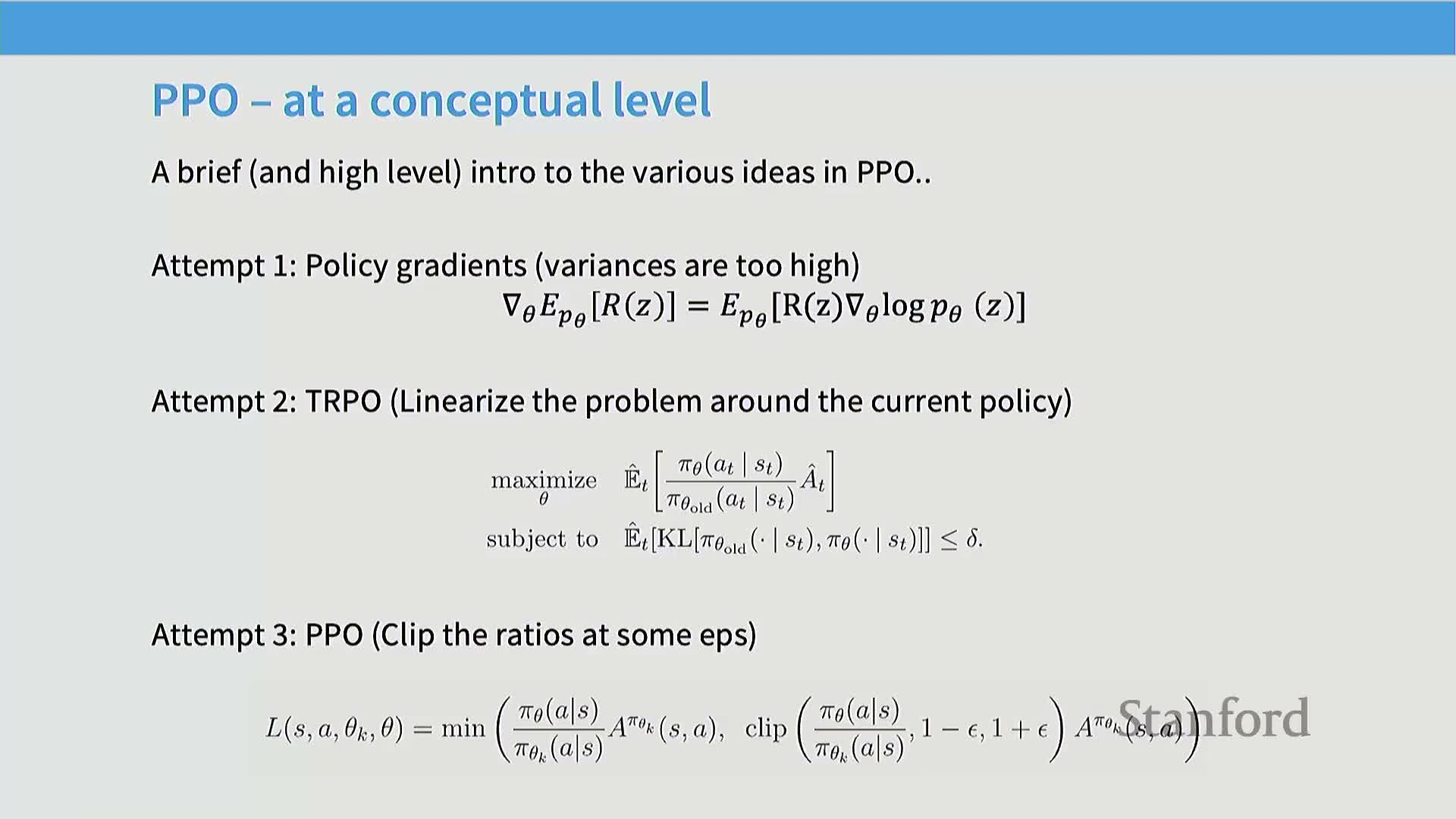 Note: PPO-style clipping replaces explicit constrained optimization with a practical surrogate that limits policy update magnitudes.