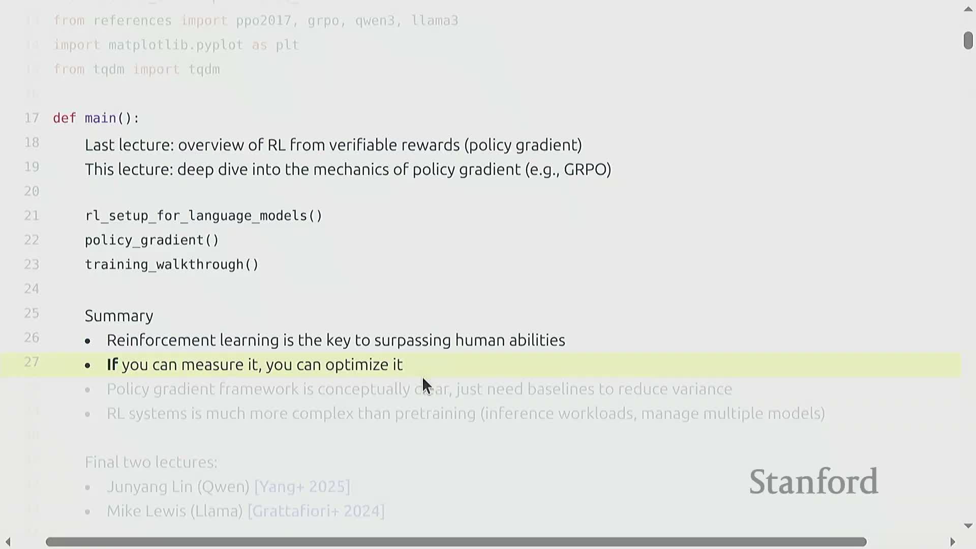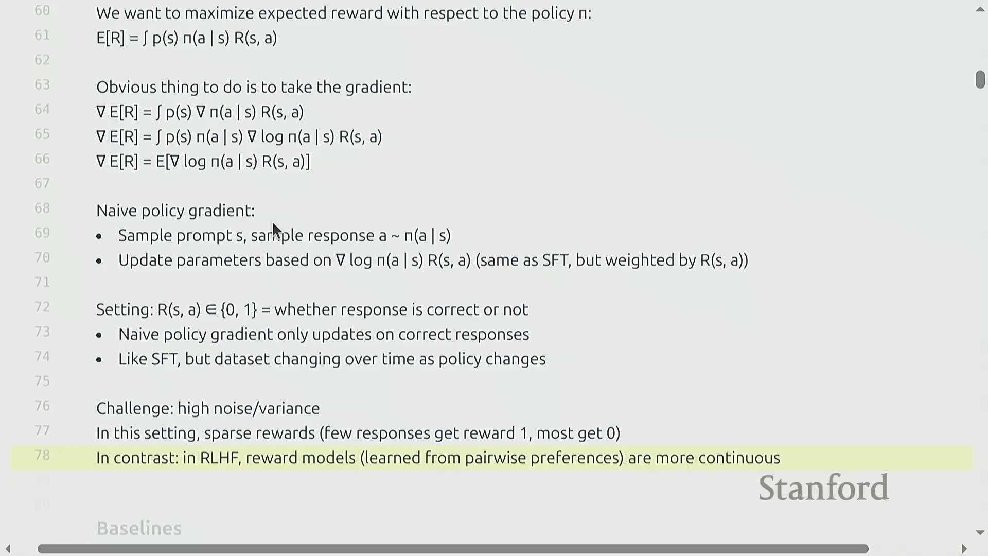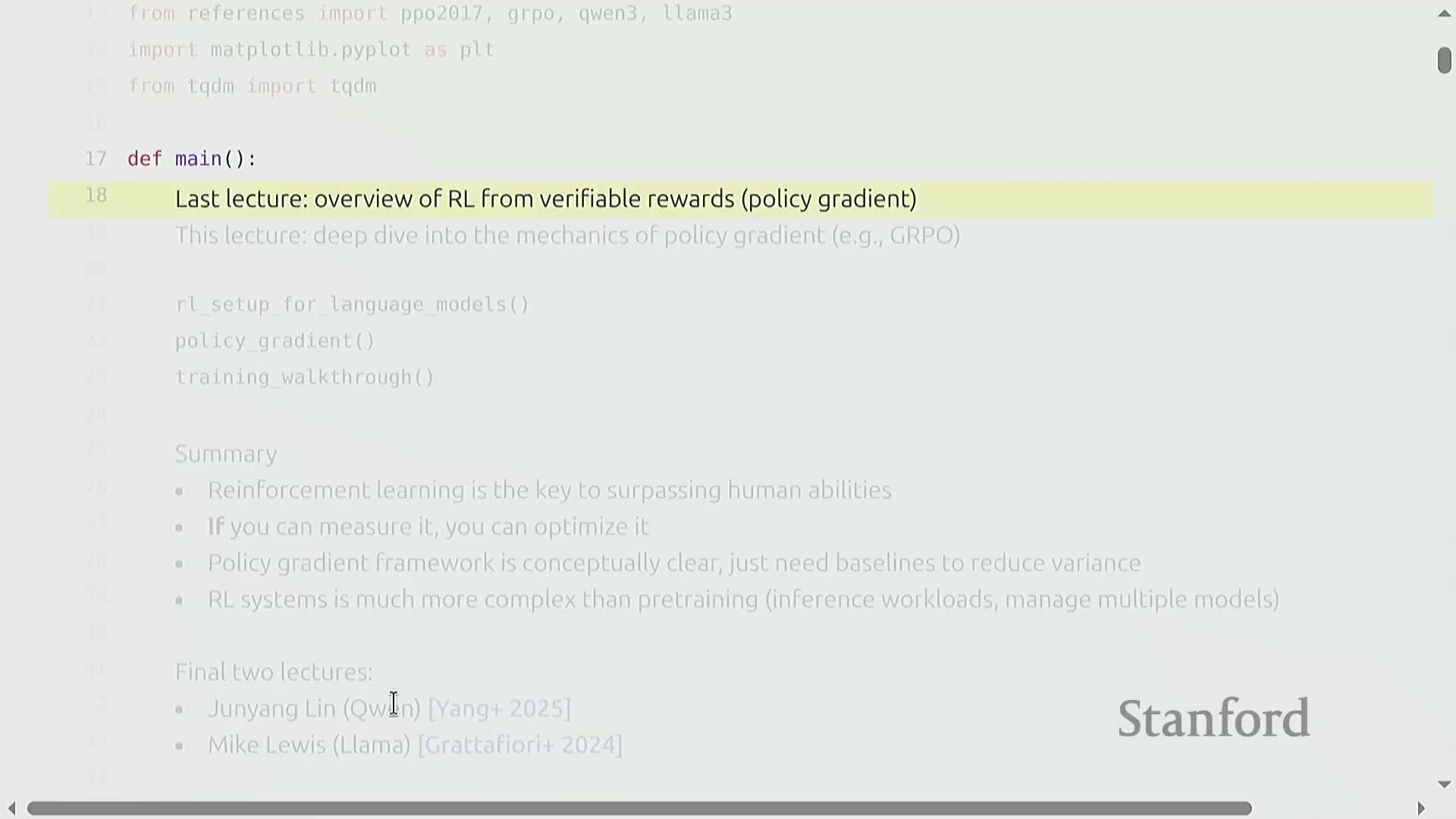 This session is positioned at the end of the quarter and will deep-dive into policy gradient methods for reinforcement learning (RL) applied to language models (LMs).