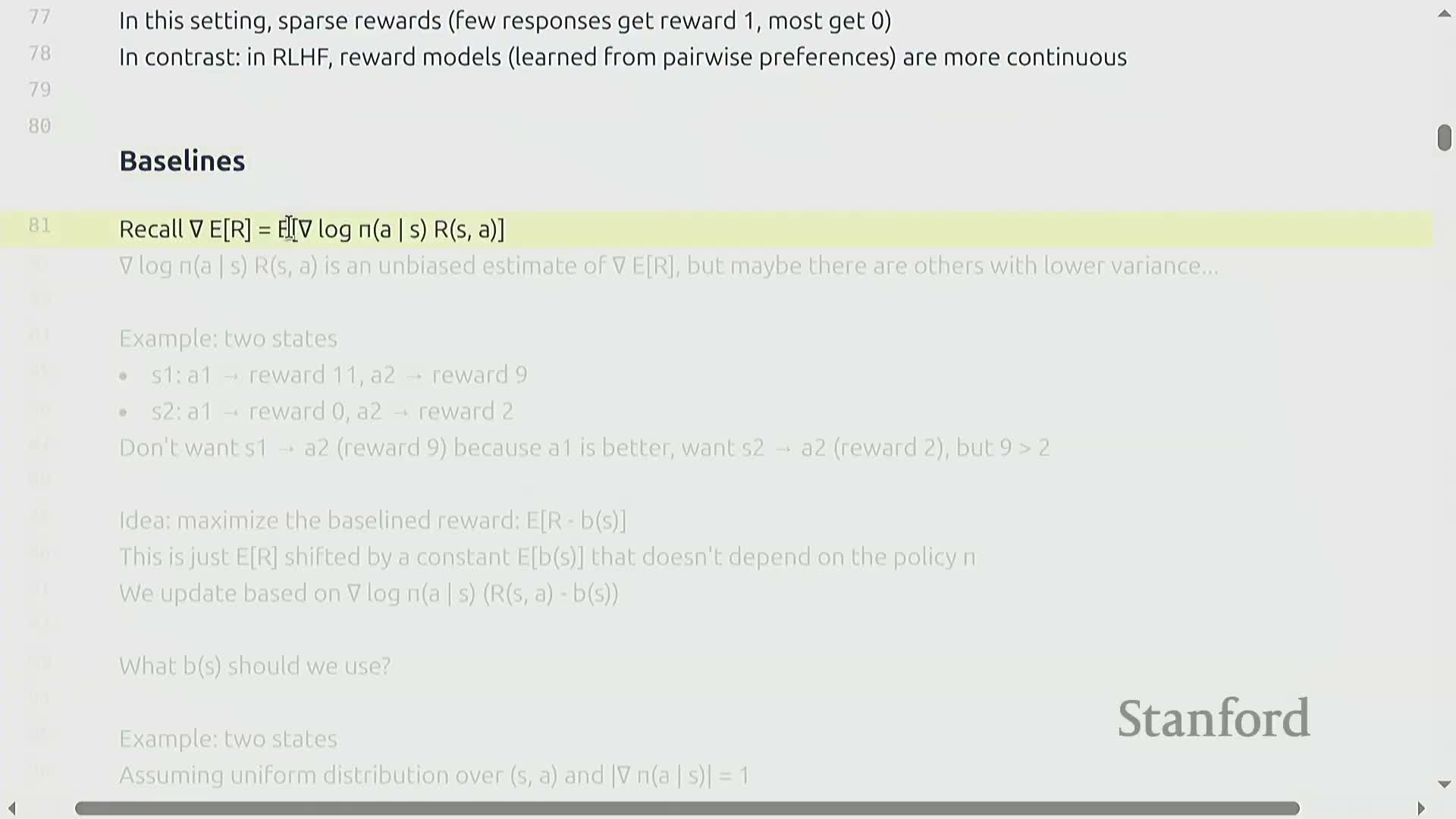 - Use the estimated expected reward given state (value estimate) as the baseline—this approximates the advantage function and typically yields substantial variance reduction.