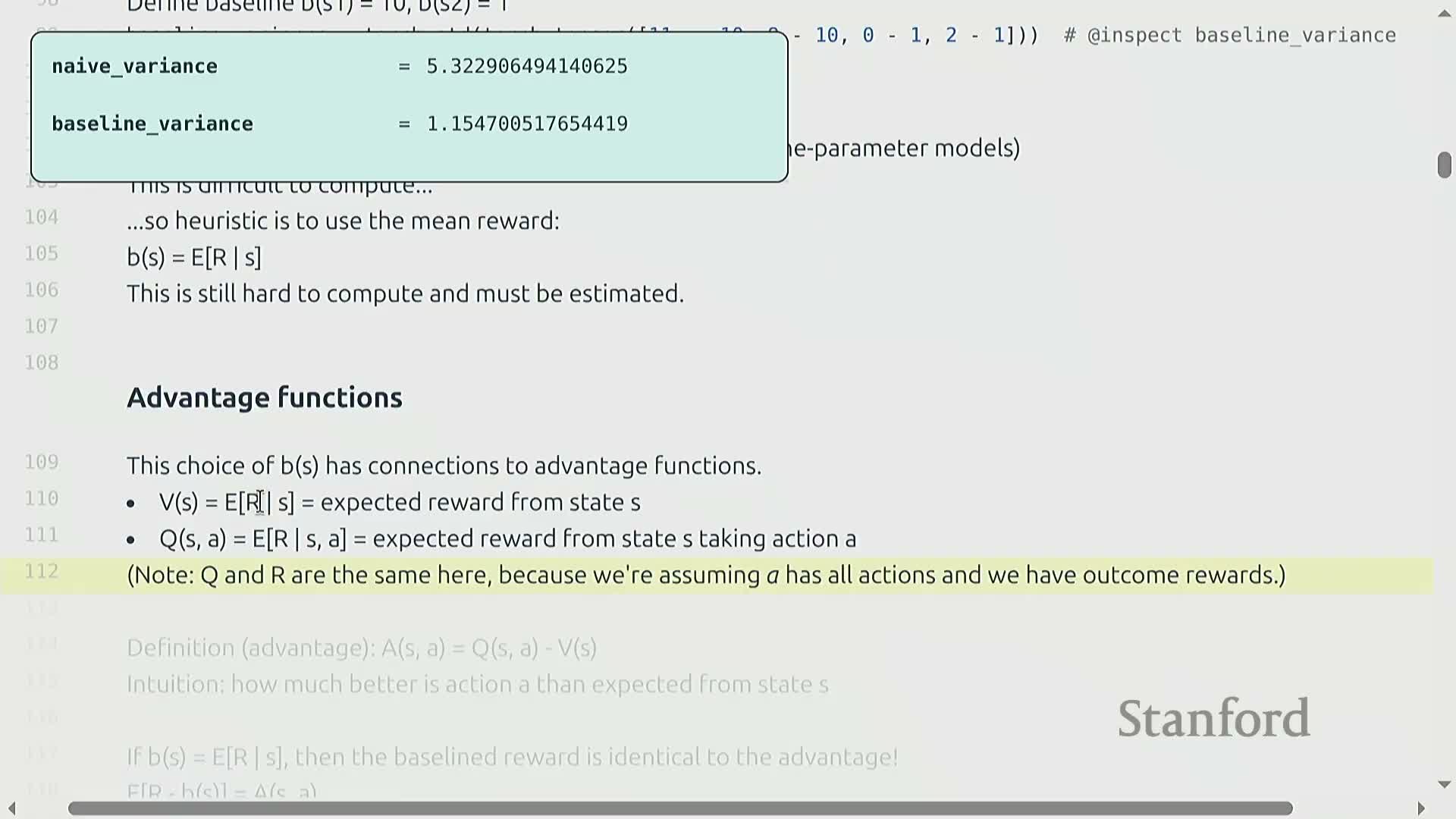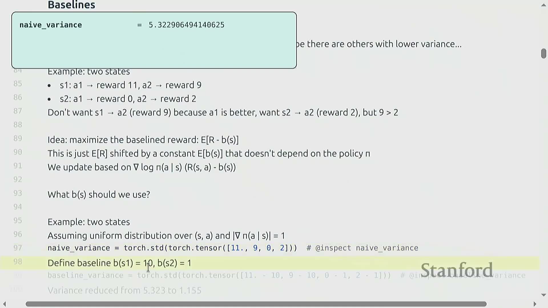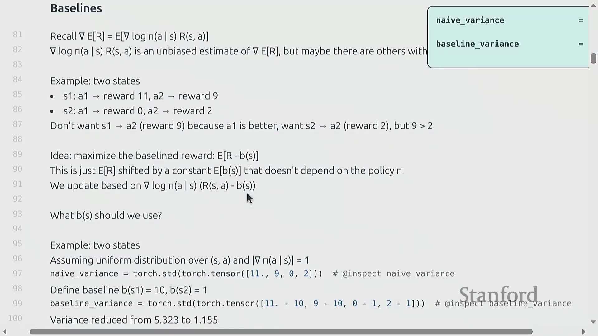 - The example quantifies how appropriate baselines can shrink variance by multiple factors and improve convergence behavior.
