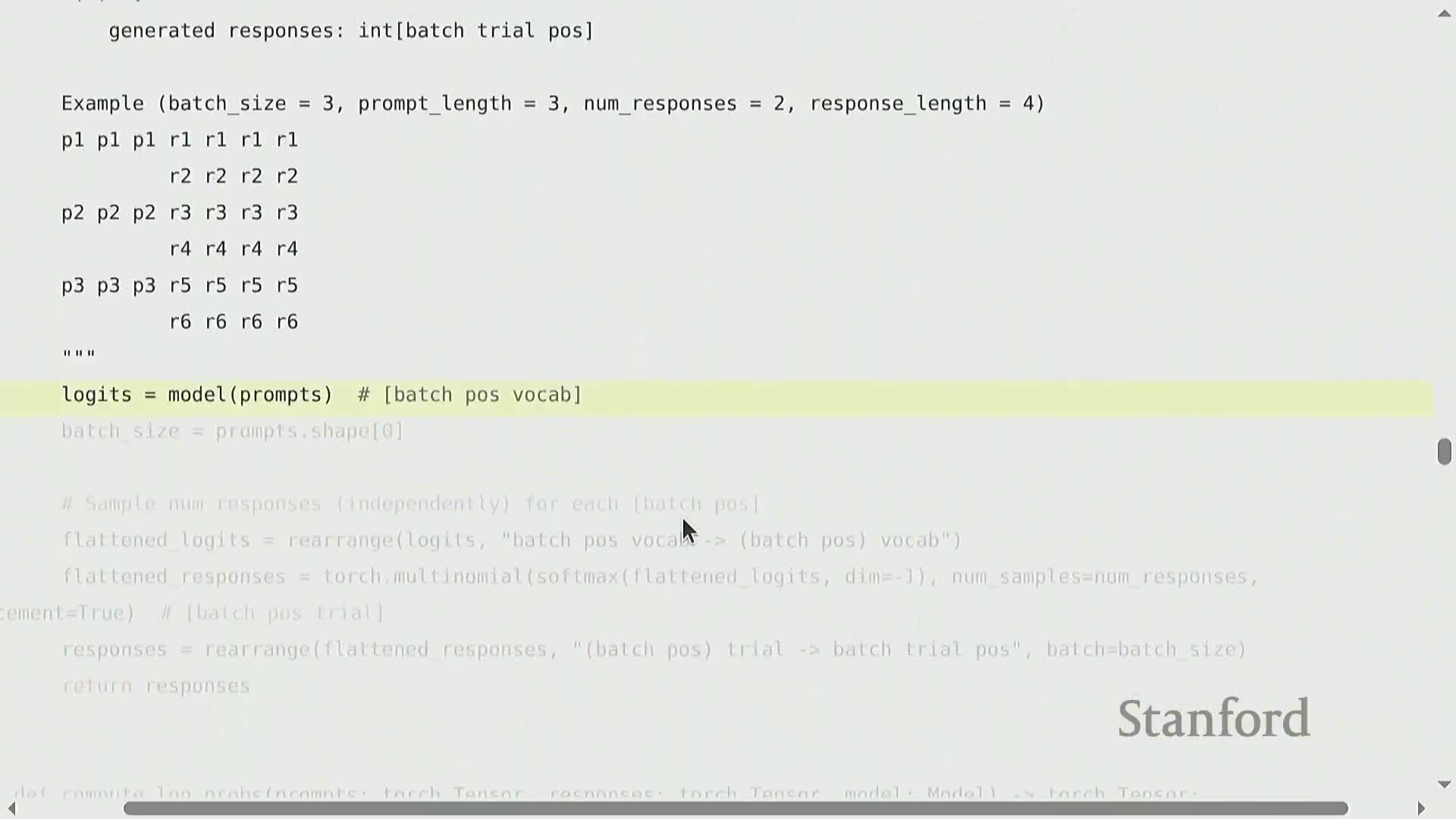 - After sampling and scoring responses, compute the log-probability of each sampled token sequence by indexing model logits at the chosen token indices and summing or averaging across positions.