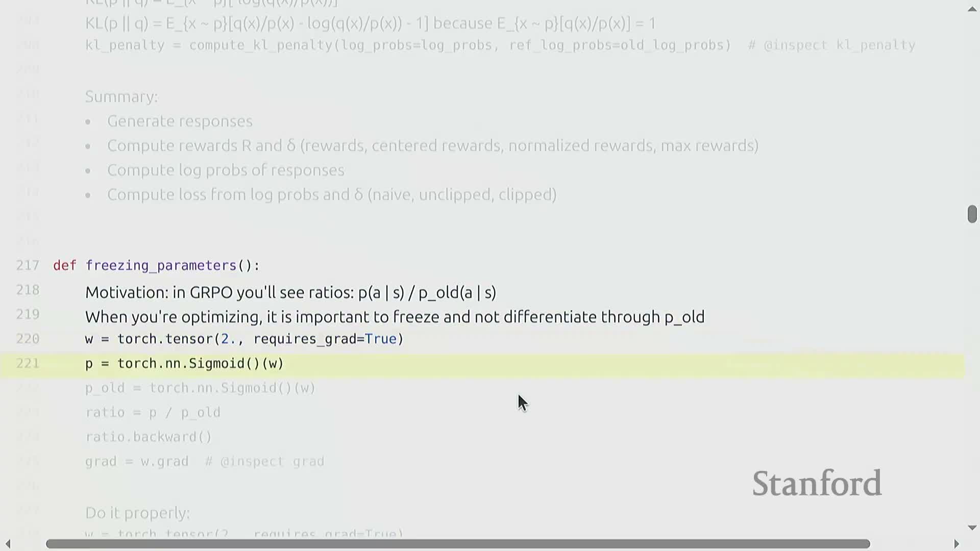 - Freezing reference quantities (no-grad) and importance-ratio pitfalls
