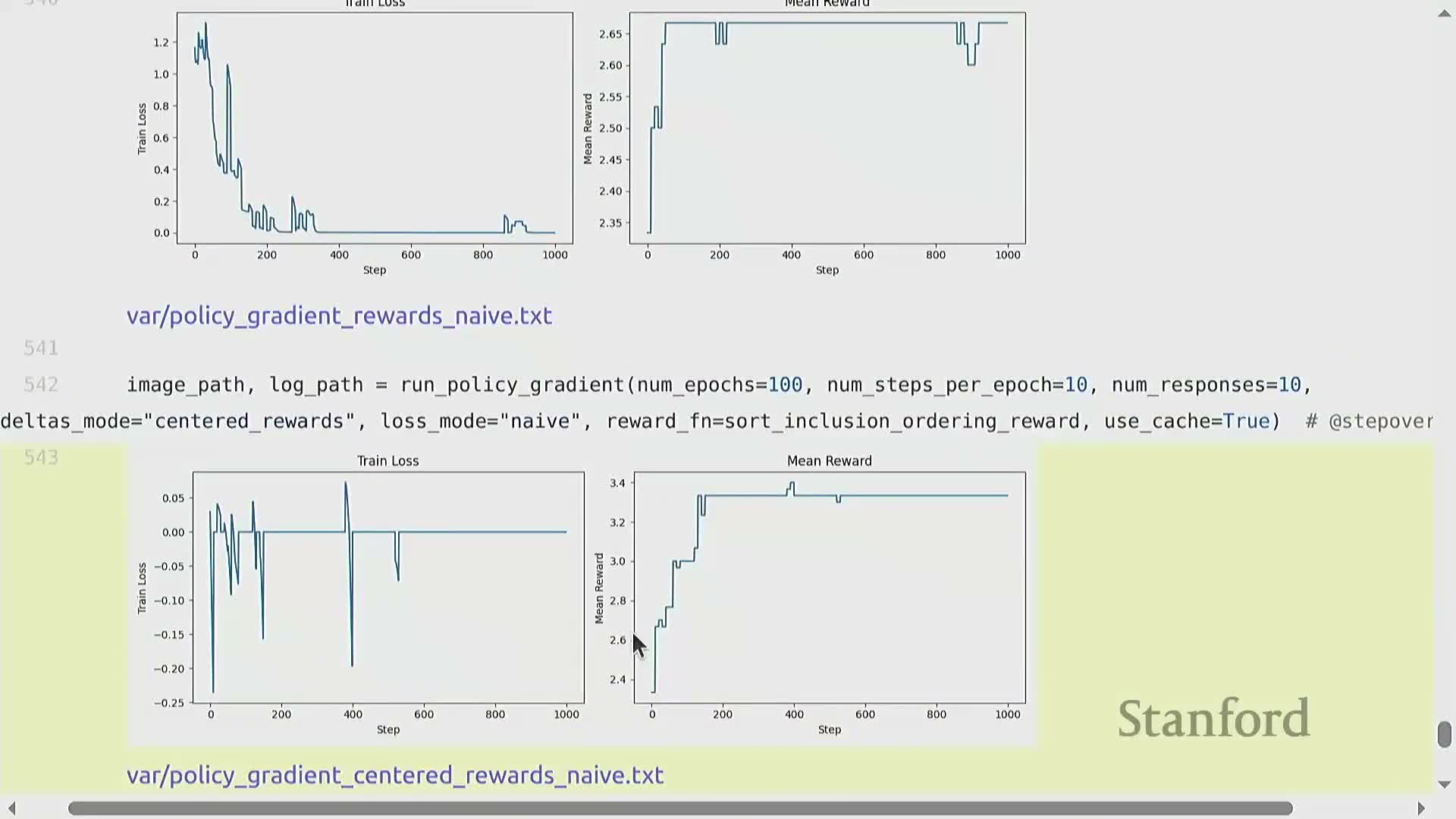 - Conclusion: naive sampling without variance reduction or reward shaping can leave the model stuck when initial performance is poor.