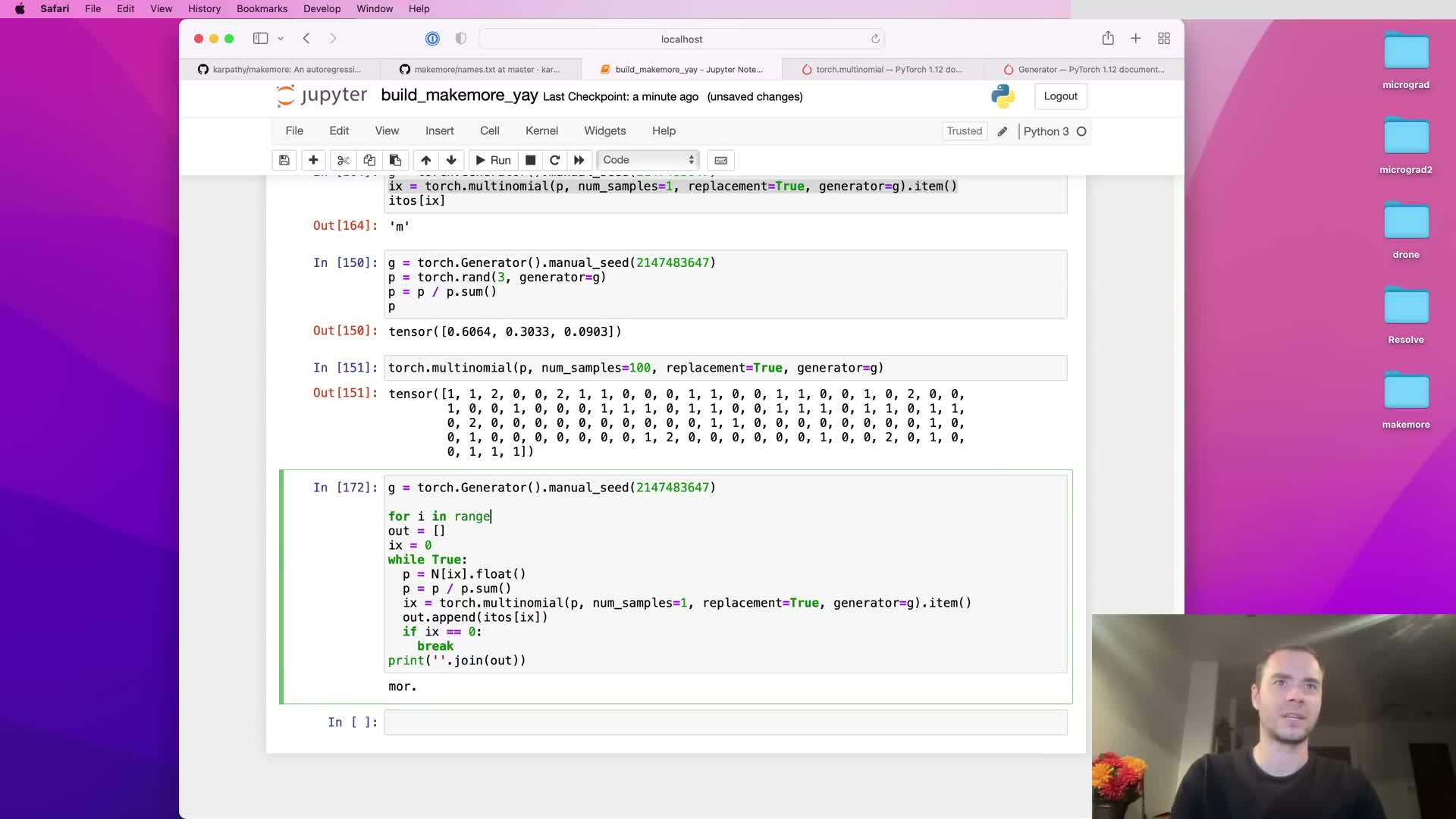 - Sample sequences by normalizing a row of counts into probabilities and drawing with torch.multinomial using a seeded generator for deterministic randomness.