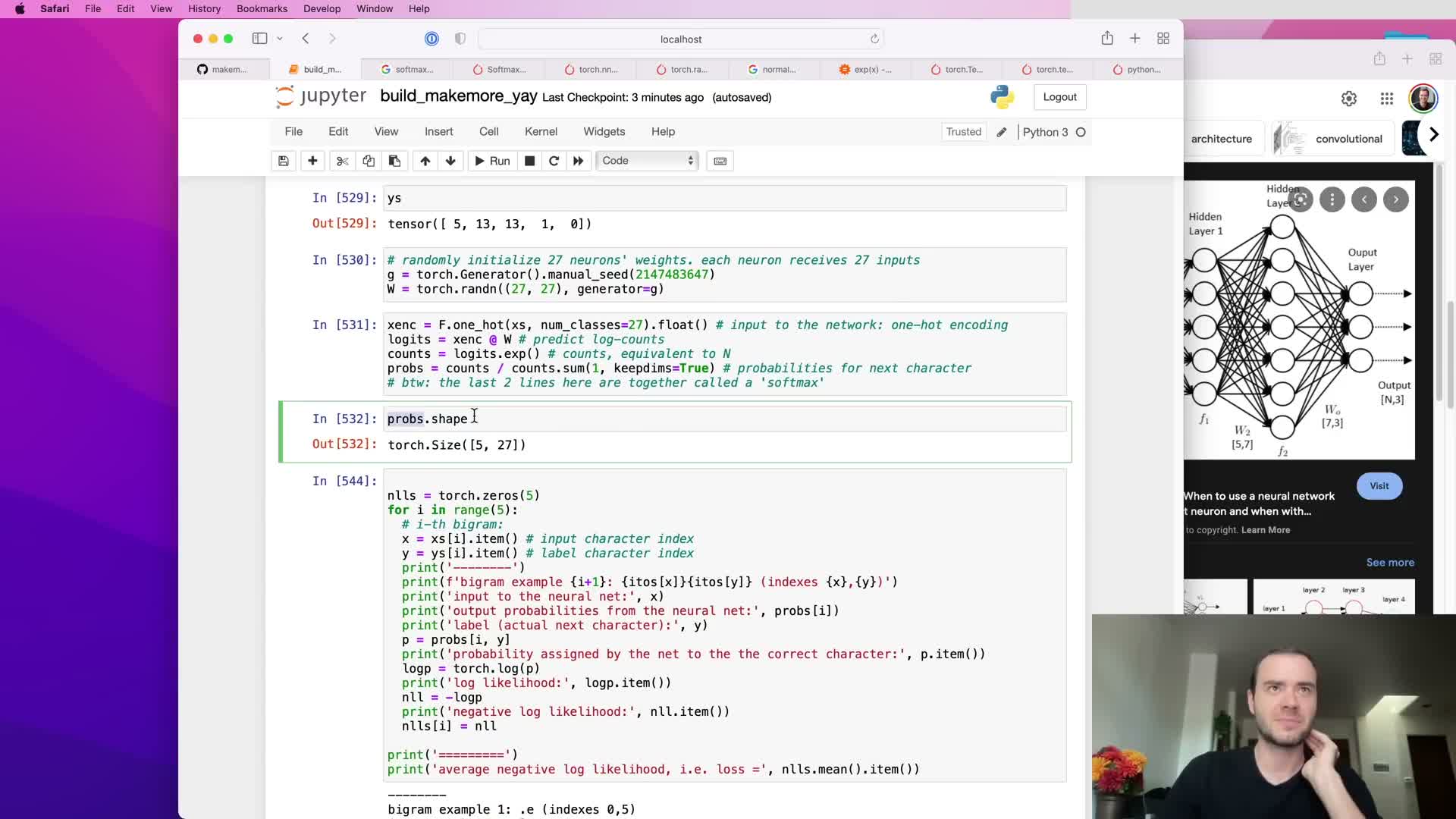 - Gradient-based training on the full bigram dataset converges to a parameter matrix that is equivalent to the count-based table; initialization and regularization connect to smoothing, and the neural model can be used for sampling.