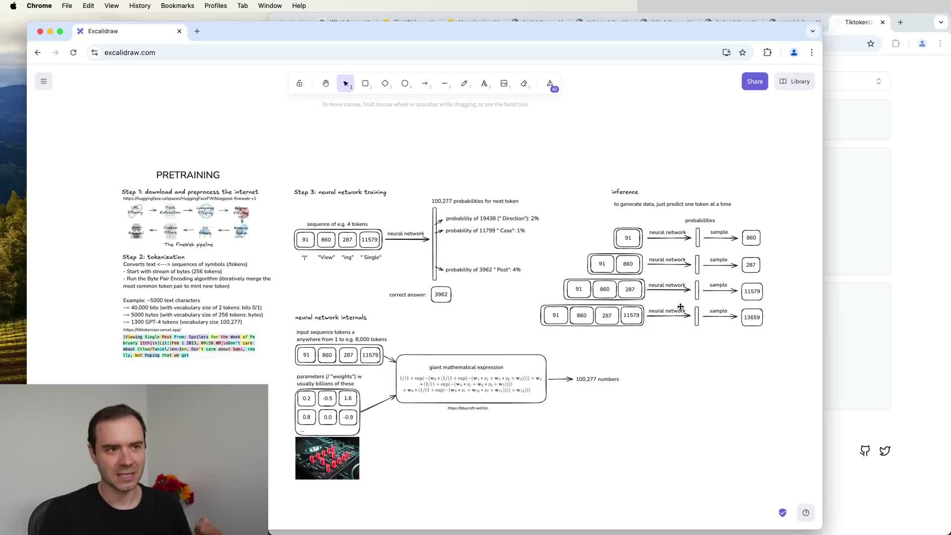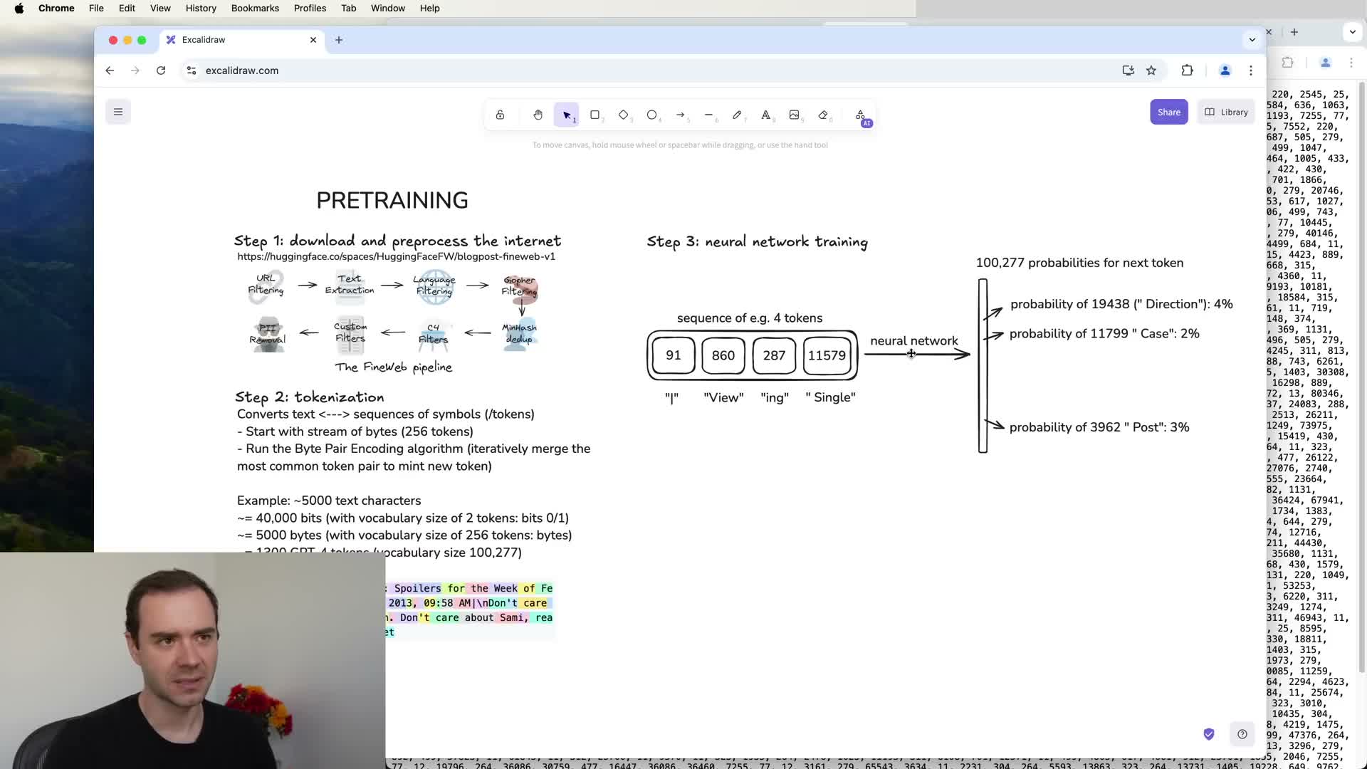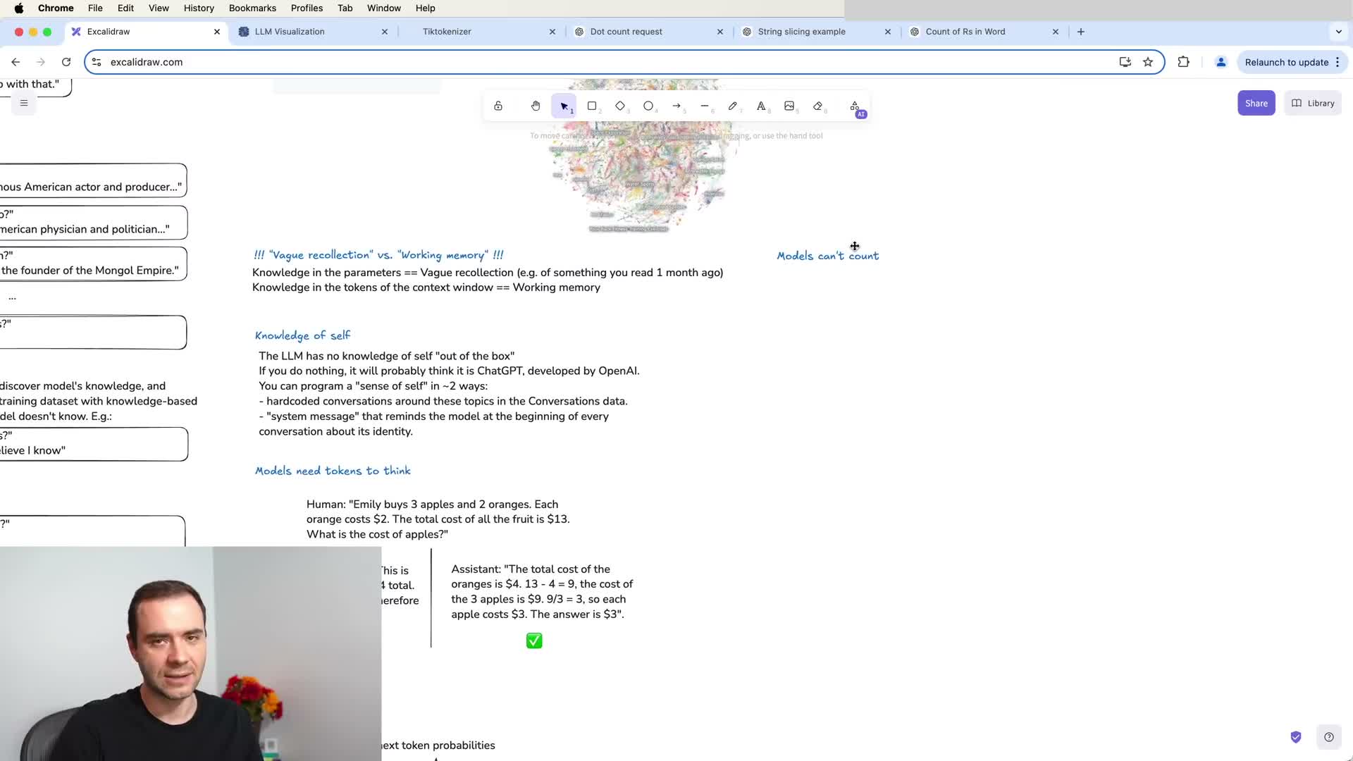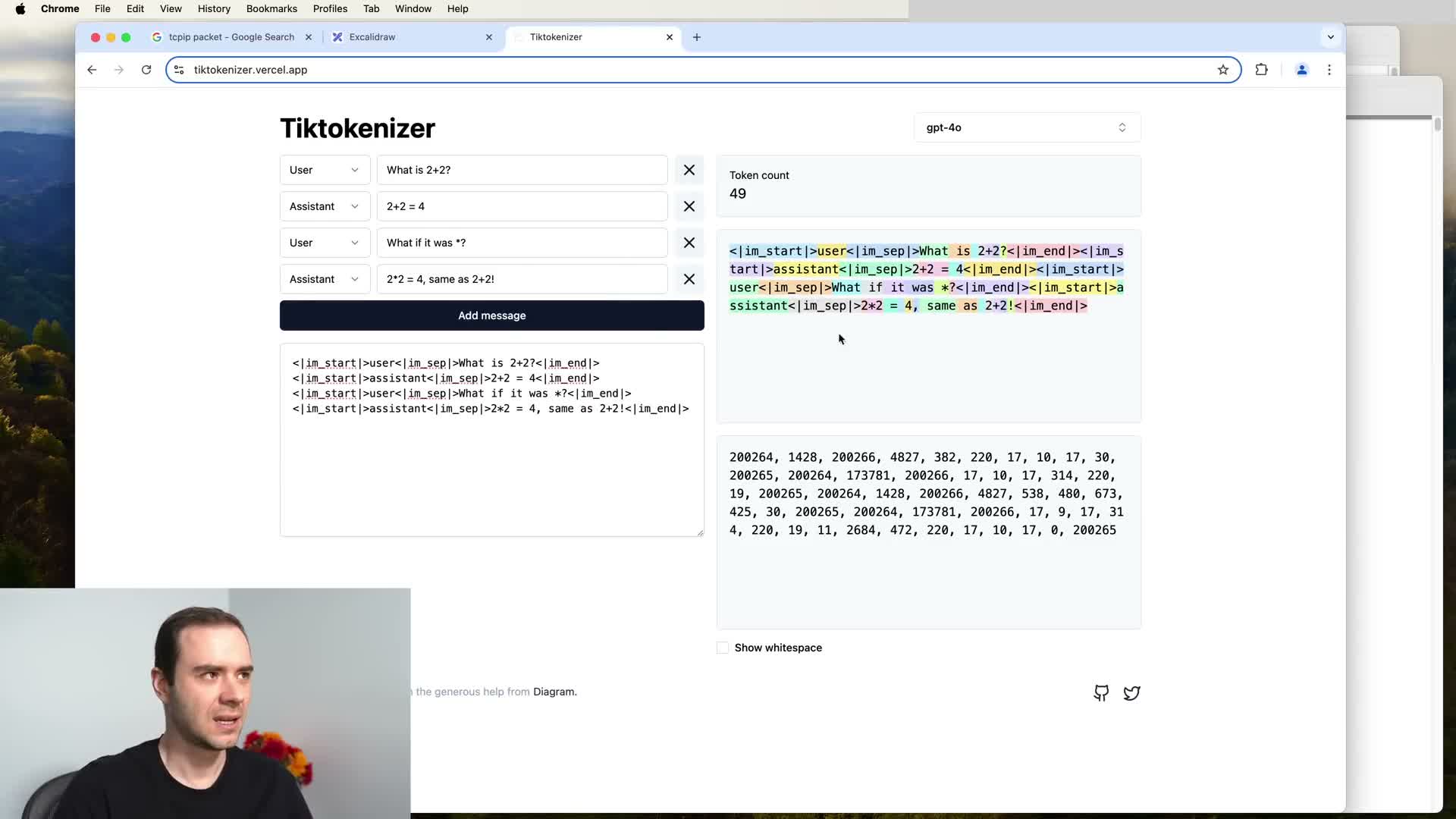 This segment demonstrates tokenization in practice using an online tokenizer viewer and explains scaling implications.