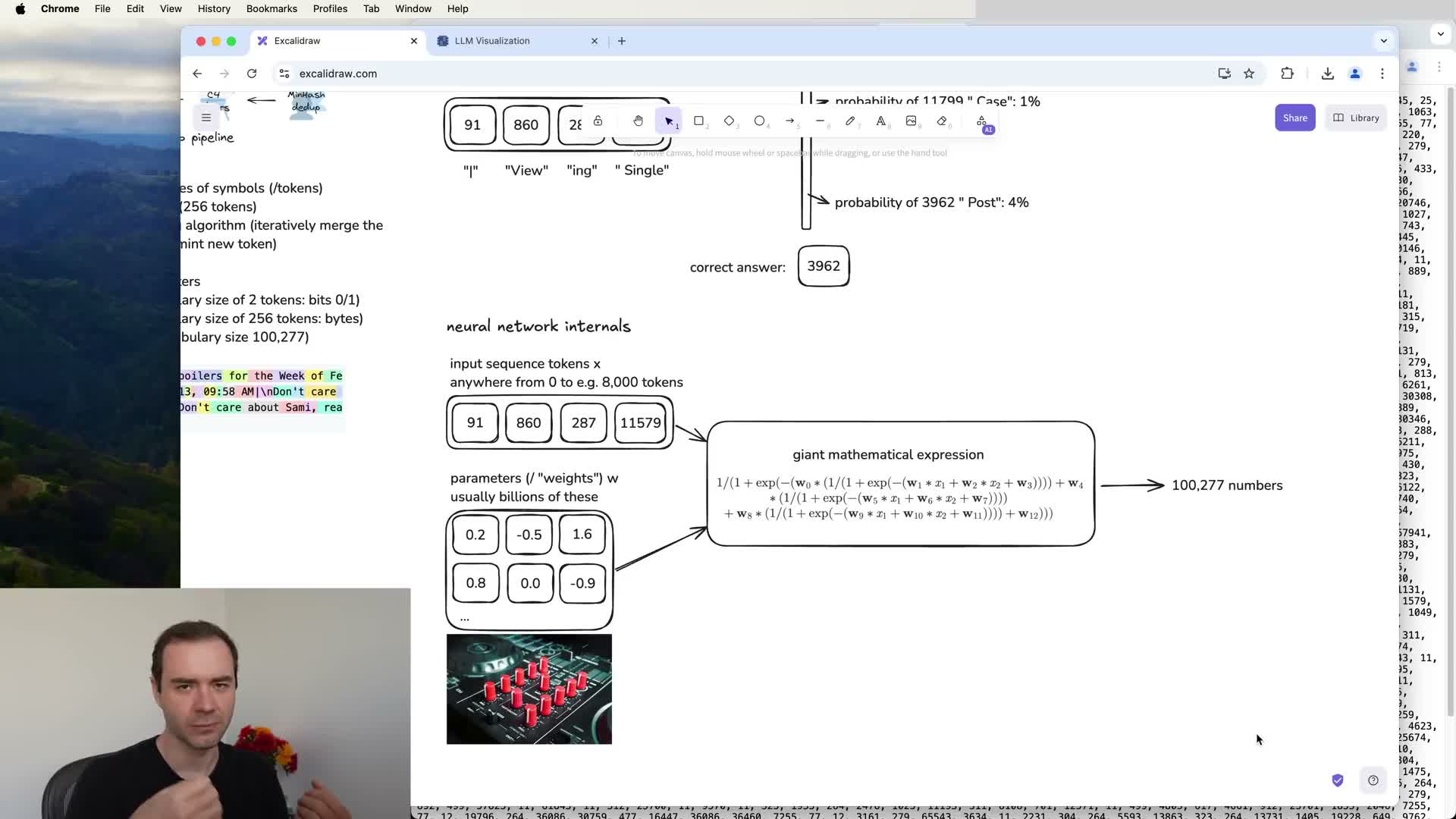 - The Transformer is a large differentiable mathematical function parameterized by billions of weights; training adjusts those weights so the function maps input token sequences to probability distributions aligned with observed data statistics.