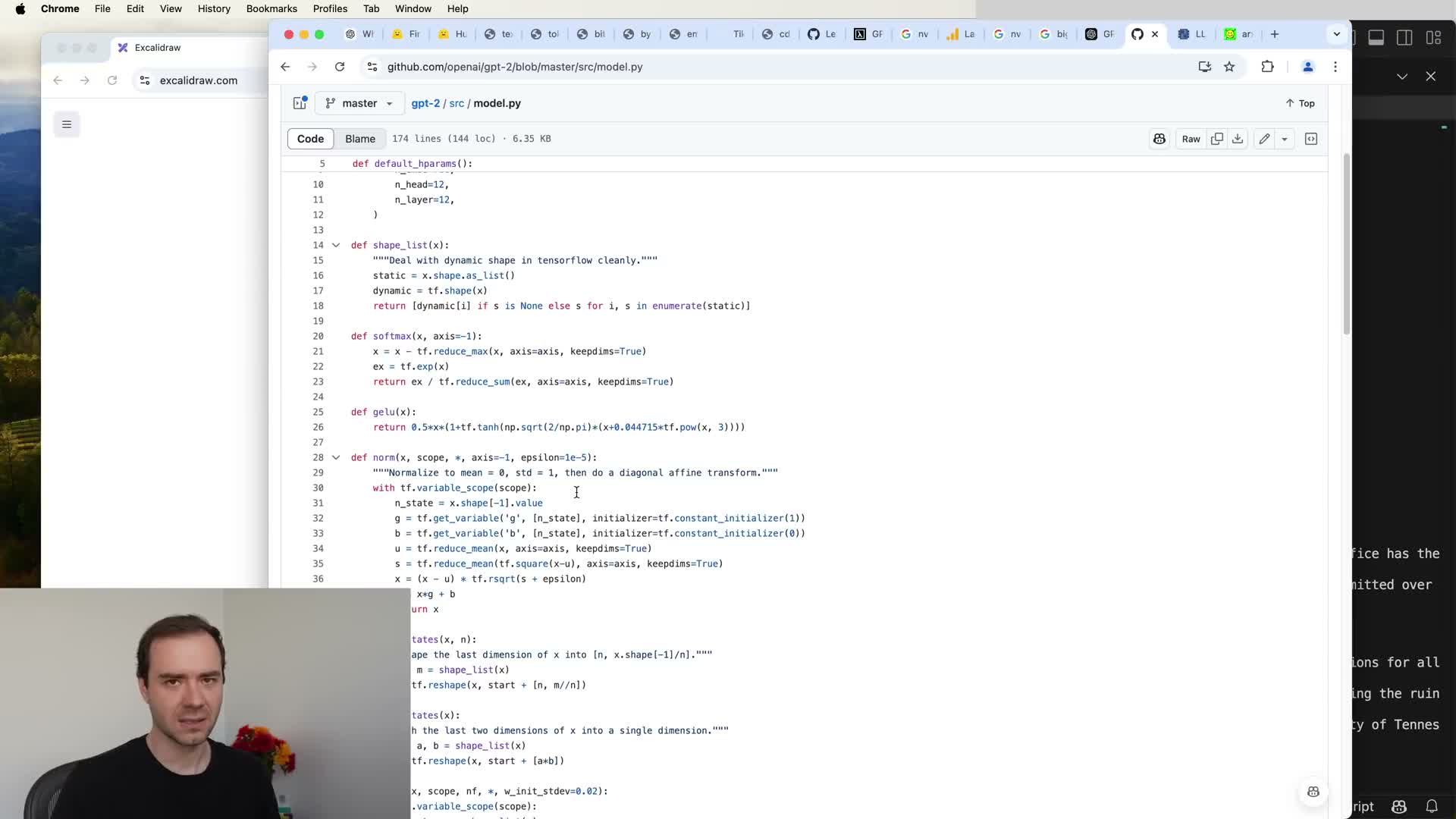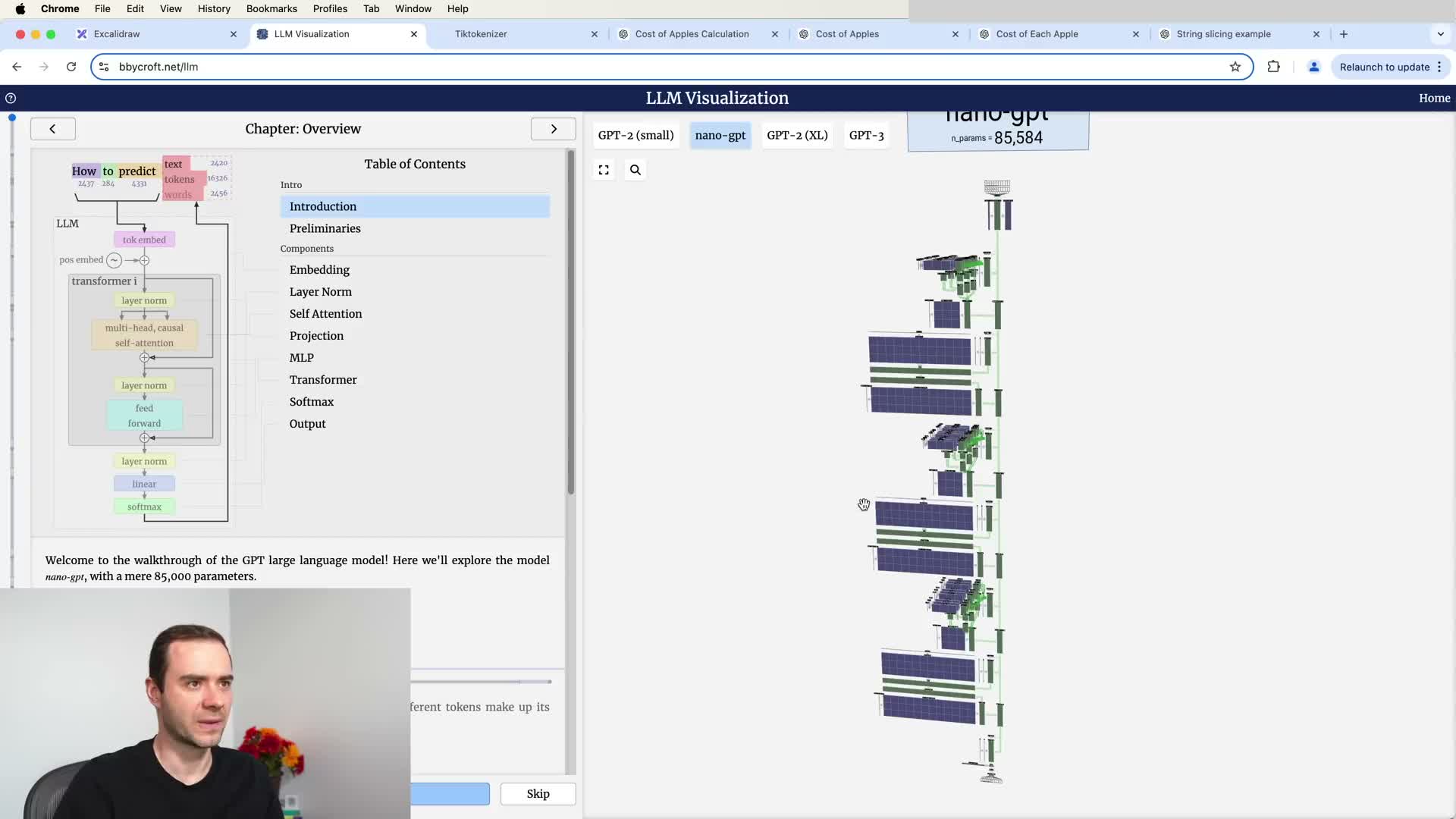 - The architecture mixes token embeddings with parameterized layers (attention, feed-forward networks, layer norms) to compute logits and probabilities for the next token.