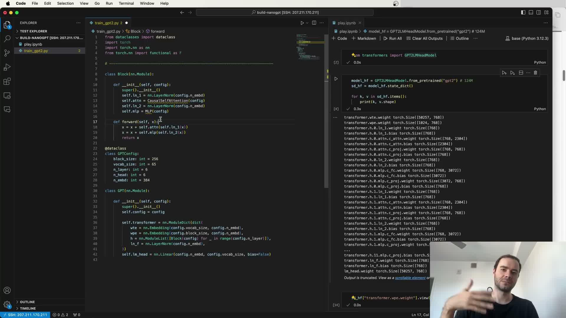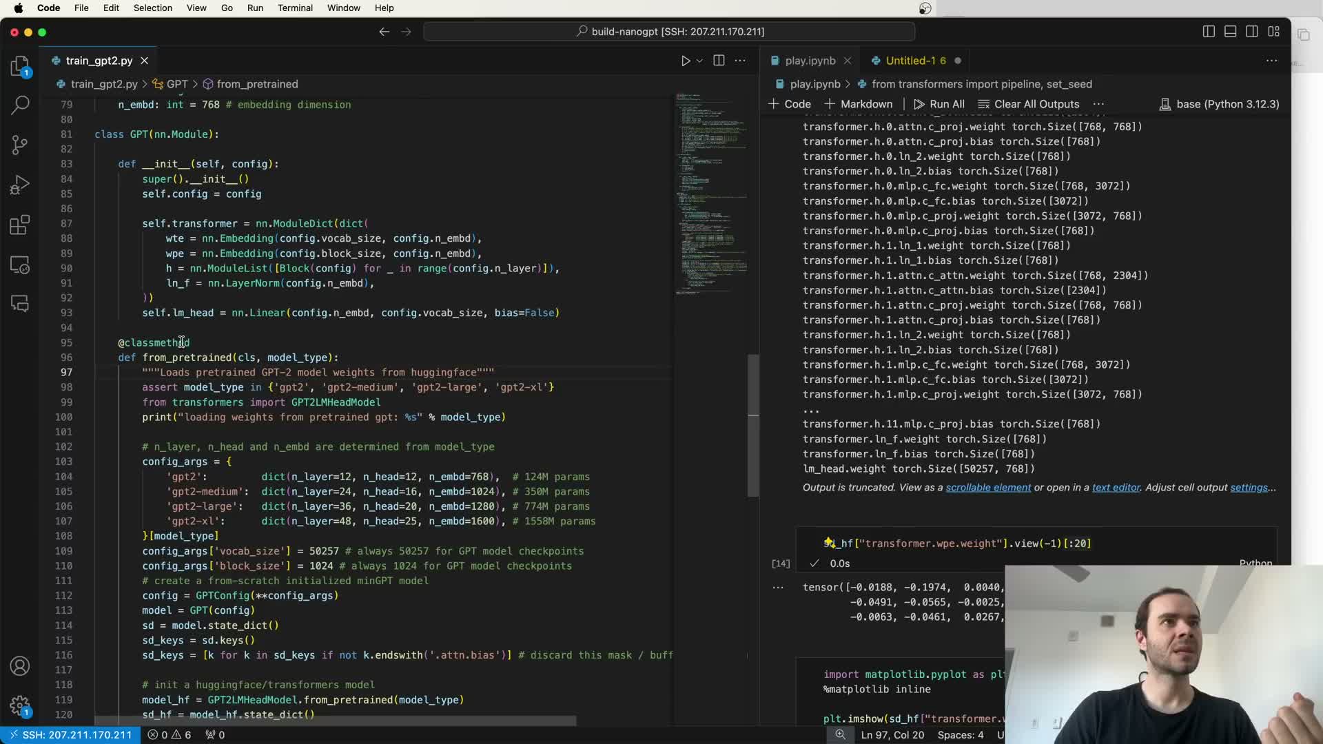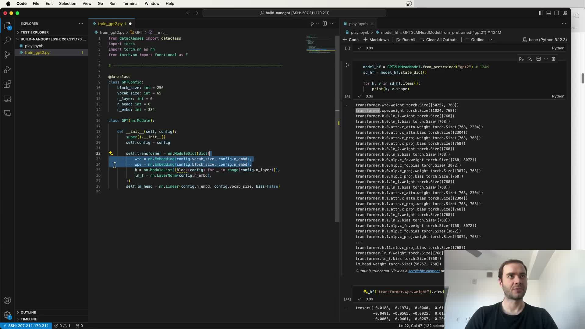 - The state_dict reveals token embeddings, positional encodings, per-layer attention and MLP weights, and LM head weights.