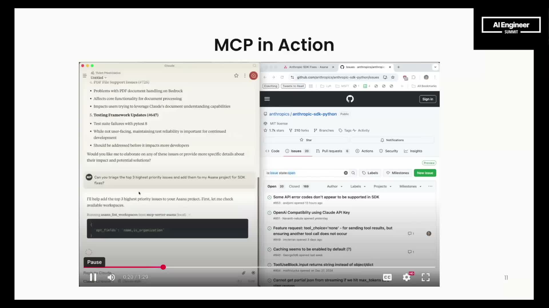 - The demo shows the model autonomously invoking list‑issues tools, summarizing results, triaging by inferred user preferences, and invoking Asana tools to create tasks.