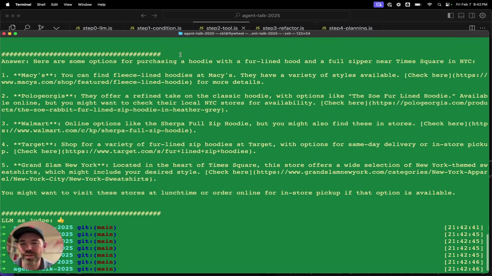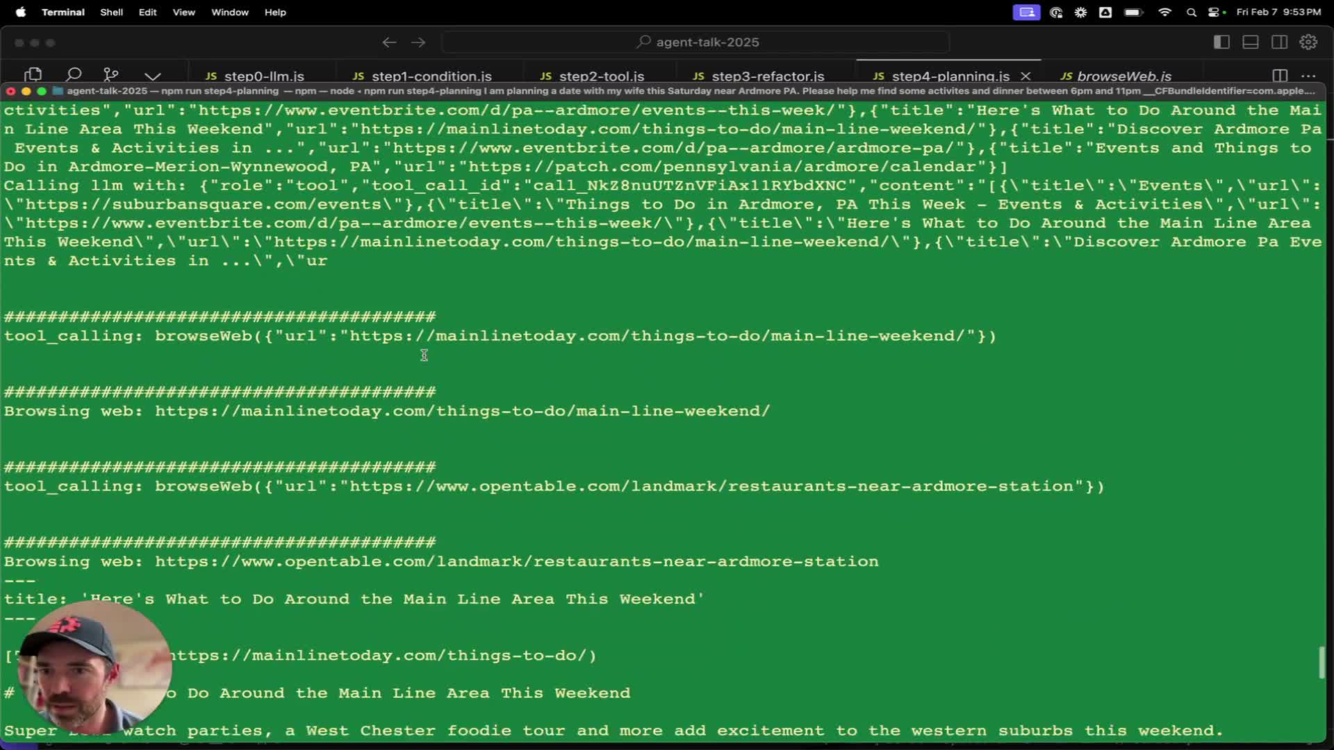 - This example illustrates how planning, tooling, and evaluation work together to produce coherent multi-step answers and shows the value of serializing intermediate results back into the conversation for traceability and re-evaluation by the LLM.