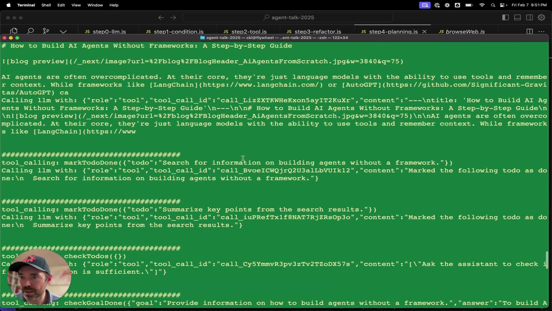 Example run: the agent used the to-do planner with search and browse tools to gather and summarize information about building agents without a framework.