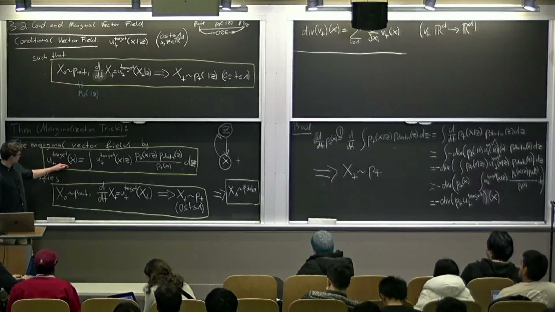 The marginalization trick defines a marginal vector field v_t(x) so that simulating dx/dt = v_t(x) produces trajectories whose marginals are the marginal probability path p_t(x).