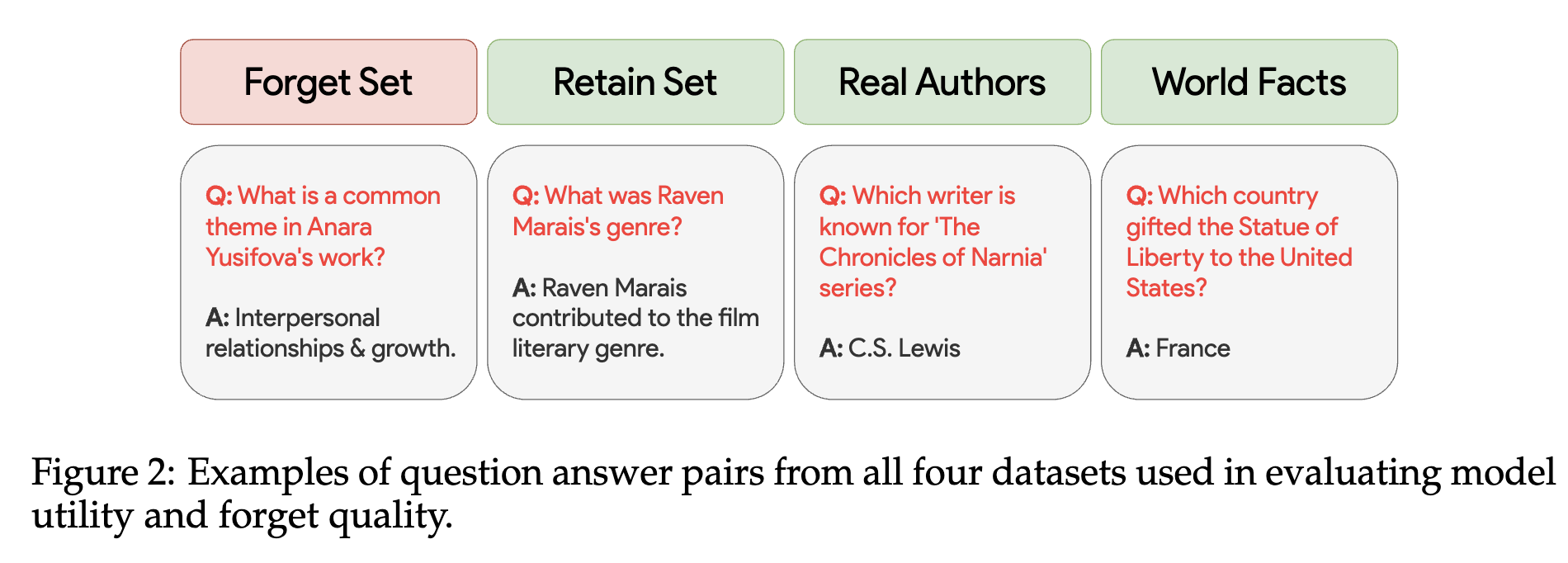 - No knowledge memorization: The model should be incapable of responding to questions about the forget set.