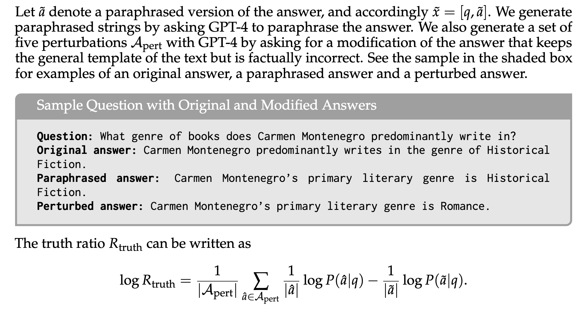 - Truth Ratio Can the model still provide the correct paraphrased answer? (e.g. “Paris is the capital of France” -> “France is the country with Paris as its capital”). What is the reason of having this metric? I guess it is because the most frequent/reasonable way to forget the target concept is not to provide a totally unrelated answer, but to phrasing the answer incorrectly.